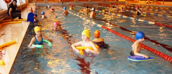 Pierwszy dzień ferii uczniowie klas III- VI spędzili bardzo aktywnie. Pod opieką swoich wychowawczyń, p. K. Balewskiej, p.K. Muchowskiej i p. G. Rachubki doskonalili swoje umiejętności pływackie na basenie w Grudziądzu. Wielu radziło sobie samodzielnie, inni wspomagali się sprzętem do nauki pływania. Kolorowe makarony, deski nie tylko ułatwiały poruszanie się na „głębokiej wodzie”, ale były także elementem świetnej zabawy. Nad bezpieczeństwem pływających czuwały organizatorki wyjazdu, a także ratownicy pracujący na pływalni.
