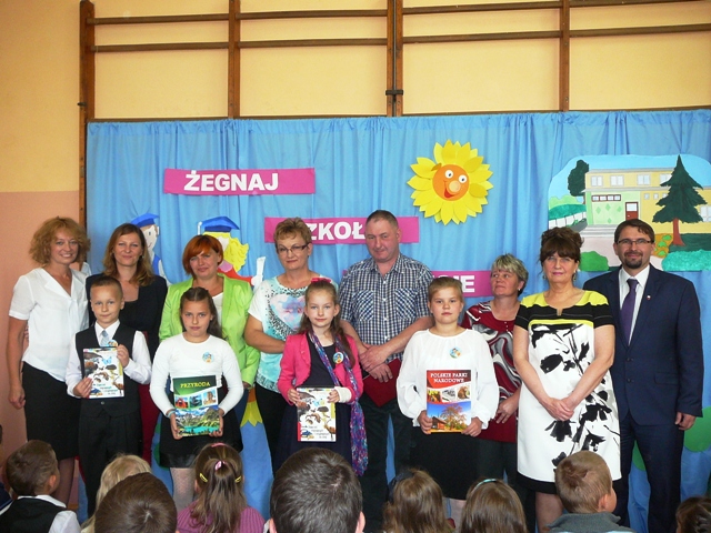 Uroczystość zakończenia roku szkolnego rozpoczęła się jak zawsze na placu przed szkołą odśpiewaniem hymnu państwowego i wciągnięciem flagi na maszt. Potem przeszliśmy do sali gimnastycznej. Tutaj wszystkich powitała pani Dyrektor. Wśród zaproszonych gości byli wiceburmistrz Nowego pan Zbigniew Lorkowski, radny powiatowy pan Zbigniew Kapusta, nadleśniczy Nadleśnictwa Osie pan Marek Sobczak, proboszcz parafii Mątawy ks. Ryszard Thiede, sołtys Mątaw pani Katarzyna Kubacka i sołtys Tryla pani Katarzyna Sikorska. Po kilku słowach refleksji na temat minionego roku wygłoszonych przez panią dyrektor przyszła pora na wręczenie odznak „Wzorowy uczeń” dzieciom z klas I- III i świadectw z biało – czerwonym paskiem uczniom z klas IV- V. Ceremoniału dekoracji dokonał pan wiceburmistrz, listy gratulacyjne rodzicom wręczyła pani dyrektor, zaś nagrody książkowe wyróżnionym wychowawczynie.