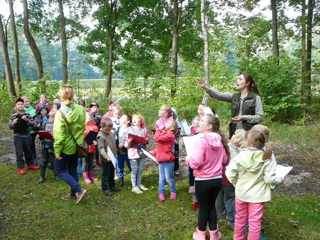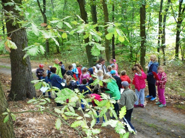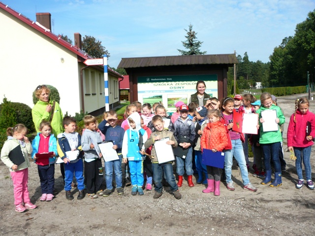 22 września uczniowie klas I- III wraz ze swoimi wychowawczyniami wybrali się na wycieczkę przedmiotową do Leśnictwa Osiny. Przed leśniczówką czekała na nich pani podleśniczy Aleksandra Marciniak, która zaprosiła wszystkich do pięknej sali edukacyjnej. Uczniowie mogli pochwalić się znajomością nazw leśnych zwierząt i roślin. Usłyszeli także o piętrowej budowie lasu. Każdy uczeń otrzymał kartę pracy, na której zaznaczone były poszczególne piętra i zapisane ich nazwy. Podczas wędrówki leśnymi ścieżkami wszyscy słuchali wyjaśnień pani leśnik, uważnie obserwowali otaczającą przyrodę, a swoje spostrzeżenia w formie pisemnej bądź rysunkowej odnotowywali na karcie pracy. I tak w piętrze wysokich drzew znalazły się dęby, brzozy i sosny, podszyt wypełniły młode drzewka i krzewy leszczyny, runo ozdobiły dzwonki leśne, grzyby, mech i paprocie, zaś w ściółce znalazły się martwe liście, owady… Każdy zabierze swoją kartę do szkoły, przyda się podczas zajęć edukacji przyrodniczej. Po wyczerpującej wędrówce wszyscy dotarli do leśniczówki. Tym razem czekała na dzieci pani leśniczy Kamila Bonk – Pawlicka. Zadała uczniom kilka pytań, chcąc sprawdzić, co dzieci zapamiętały podczas „leśnej” lekcji. Następnie wycieczkowicze udali się do pięknej, drewnianej wiaty. Tam można było odpocząć, podzielić się wrażeniami z leśnej wyprawy. Wszyscy chętnie posilili się upieczonymi przy ognisku kiełbaskami i chlebem. Bardzo przyjemnie było także nad jeziorem. Z pomostu rozciągał się piękny widok na las i jego odbicie w toni jeziora. Na zakończenie spotkania pani leśniczy sprawiła uczniom niespodziankę. Włączyła deszczownie, które podczas upałów zasilają w wodę rosnące w szkółce krzewinki. Wielu uczestników wycieczki miało wielką ochotę na taki wrześniowy prysznic pod gołym niebem, jednak czujne wychowawczynie profilaktycznie zabrały dzieci do czekającego już autobusu, dzięki czemu wszyscy cało, zdrowo i SUCHO udali się w powrotną drogę do szkoły.