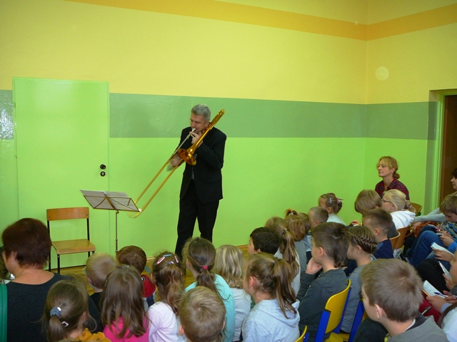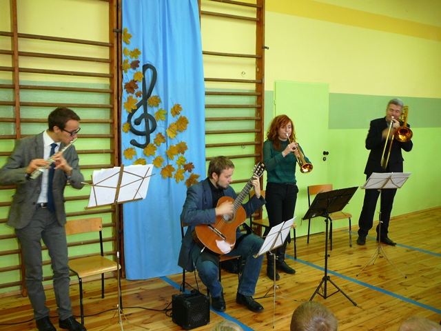 Dzisiaj po raz pierwszy w tym roku odbyła się w naszej szkole audycja muzyczna z udziałem muzyków z Toruńskiej Orkiestry Symfonicznej. Mogliśmy na żywo posłuchać utworów granych na flecie, gitarze, trąbce i puzonie. Jesień ma mnóstwo pięknych kolorów, ale artyści udowodnili nam ,że również instrumenty mają różnorodną barwę. Należą także do różnych instrumentalnych rodzin. I tak trąbka i puzon to instrumenty dęte blaszane, flet poprzeczny reprezentował instrumenty dęte drewniane, zaś gitara była przedstawicielką instrumentów strunowych szarpanych. Muzycy pokazali nam ,jak zbudowane są instrumenty, na których grają i w jaki sposób wydobywa się z nich dźwięk.