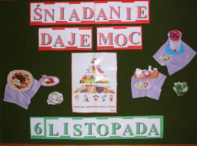 6 listopada nasza szkoła wzięła udział w akcji Śniadanie Daje Moc. Byliśmy jedną z wielu szkół w Polsce, w których w tym dniu uczniowie wraz ze swoimi wychowawczyniami, przy czynnym udziale nieocenionych mam, przygotowywali zdrowe, smaczne śniadanie. Już od rana rozpoczął się w klasach 0- III wzmożony ruch. Pracowały sokowirówki, usłyszeć można było odgłos krojonych warzyw i owoców, ale przede wszystkim z klas dobiegał radosny gwar przejętych akcją dzieci. W każdej klasie przygotowano pięknie nakryte stoły, na których pojawiły się pyszne i zdrowe śniadaniowe smakołyki. Wspólne spożywanie śniadania okazało się bardzo przyjemne. Było także okazją do przypomnienia sobie zasad zdrowego odżywiania i kulturalnego zachowania się przy stole. Najmłodsi nie zapomnieli o swoich starszych koleżankach i kolegach. Część z przygotowanych potraw znalazła się na ustawionym w holu stole. Uczniowie klas IV- VI mogli spróbować kolorowych kanapek, sałatek z warzyw i owoców, a wszystko to popić świeżym jabłkowo – marchewkowym sokiem.