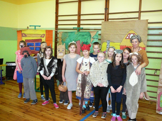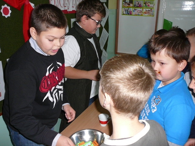 Czwartoklasistów czekały dzisiaj dodatkowe atrakcje podczas otrzęsin. Spotkanie w sali gimnastycznej rozpoczęło się od popisów aktorskich osób otrząsanych. Pod kierunkiem p. K. Balewskiej uczniowie klasy czwartej przygotowali bardzo ciekawą inscenizację pt. „Kozucha Kłamczucha”. Ciekawe kostiumy, piękna scenografia bardzo się widzom podobały, jednak to nie uchroniło występujących przed licznymi próbami, które przygotowali dla nich członkowie samorządu uczniowskiego. Czwartoklasiści zdawali egzamin ze znajomości swojej wychowawczyni, przepytani zostali z tabliczki mnożenia, musieli ułożyć wiersz o pani Kasi. Zadania dla wychowawczyni także nie były łatwe. Pani Kasi zaproszona została do tańca nowoczesnego, z zamkniętymi oczami rozpoznawała swoich uczniów uczniów po głosie i wyglądzie. Na koniec wszyscy otrząsani poczęstowani zostali sokiem z cytryny doprawionym pieprzem. Miny po wypiciu tej mikstury były… różne.