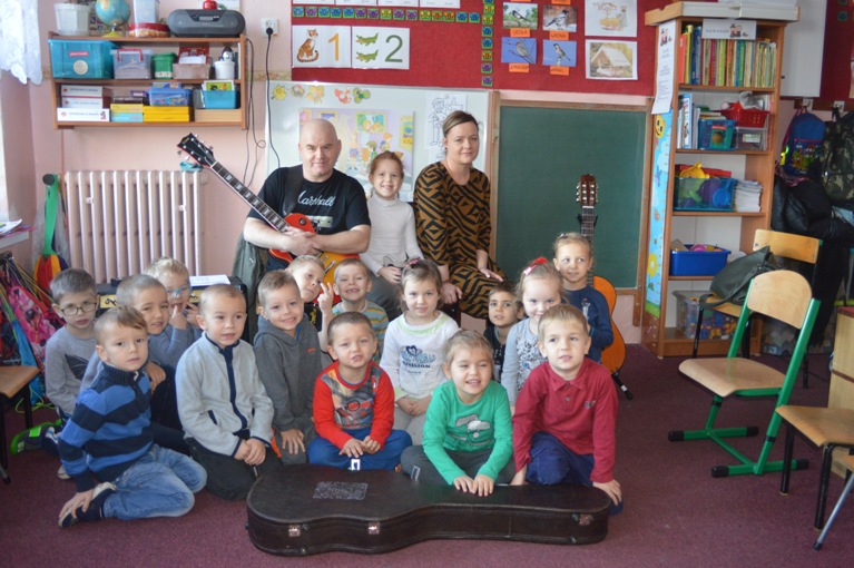 Podsumowuąc zajęcia przedszkolne dotyczące artystów zorganizowaliśmy mini koncert rockowy w przedszkolu. Zaprosiliśmy członków zespołu rockowego Vermuth: pana Wojtka oraz panią Małgosię. Salę wypełniło mocne brzmienie gitary elektrycznej oraz wokal p.Małgosi. Pan Wojtek, pasjonat gitarowego brzmienia zaprezentował dzieciom brzmienie obu gitar, a także chętnym dziociom pozwolił zagrać na elektrycznej gitarze. Dzieciom bardzo się podobało i jak to zwykle wśród przedszkolaków bywa, wielu z nich od dzisiaj marzy, aby grać na elektrycznej gitarze.