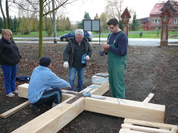 Kilka tygodni temu zrobiony został wykop, w którym zabetonowano solidny uchwyt do krzyża. Wczorajszy dzień dostarczył najwięcej emocji. Wczesnym popołudniem gotowe elementy krzyża zostały przywiezione z Nowego. Sporo wysiłku trzeba było, aby około półtonowe belki wyładować z samochodu i ułożyć tak, aby można było je skręcić długimi śrubami. Kiedy konstrukcja była gotowa, przystąpiono do najtrudniejszej czynności czyli umieszczenia ponad pięciometrowego krzyża w uchwycie. Nieodzowne było wykorzystanie ładowarki, która podniosła krzyż na wysokość półtora metra i powoli opuszczała go w metalowe mocowanie. Potem już tylko nawiercono w drewnie otwory i przykręcono je potężnymi śrubami do uchwytu.