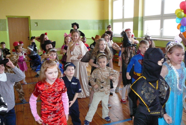 Dobiega końca tegoroczny karnawał. W dniu wczorajszym w naszej szkole odbyły się bale przebierańców. Klasy młodsze podczas swojej zabawy nie tylko tańczyły, ale także uczestniczyły w bajkowych konkursach. Dzieci karmiły woreczkami głodnego wilka, aby ten nie pożarł Czerwonego Kapturka. Wzorem Kopciuszka wybierały z popiołu mak. Naśladowały staruszka z bajki o złotej rybce i sprawdzały swoje umiejętności wędkarskie. Niektórzy popisywali się sprawnością manualną i pomagali dotrzeć na przyjęcie u Kubusia Puchatka jego przyjaciołom. Każdy uczestnik konkursu otrzymywał słodką nagrodę. Wiele emocji wzbudziły wybory królowej i króla balu. Podobnie jak w roku ubiegłym zdecydował o tym los. Dziecko , które wylosowało cukierka z niespodzianką, otrzymało ów zaszczytny tytuł. Tym razem los uśmiechnął się do Klaudii i Wanessy z klasy drugiej- obie dziewczynki otrzymały królewskie korony.