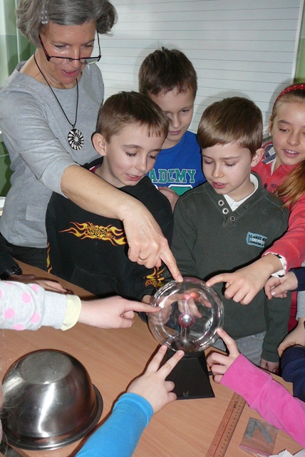 Dla nas przygotowane zostały warsztaty pt. „Prądowe rewolucje”. W bardzo przystępny sposób przekazana została wiedza o tym, co to jest prąd, czym są ładunki elektryczne, jak to się dzieje, że prąd płynie, czym jest burza i jak ona powstaje…