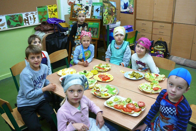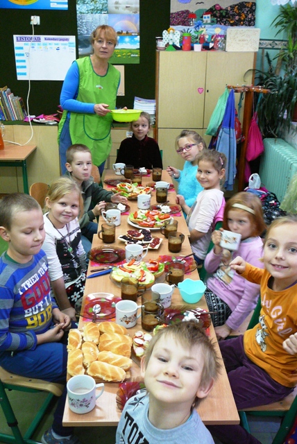 Tuż przed godziną dziewiątą w klasach 0 – 3 zauważyć można było wzmożony ruch. Dzieci pod opieką mam i wychowawczyń przystąpiły do przygotowywania zdrowego śniadania. Obieranie warzyw, krojenie owoców, przygotowywanie pysznych soków i koktajli, dekorowanie kanapek, mieszanie twarożku z rzodkiewką i śmietaną wcale nie było łatwe, ale przy wsparciu rodziców na stole pojawiały coraz to nowe śniadaniowe pyszności. Kiedy wszystko było już gotowe, uczniowie zasiedli przy starannie nakrytych stołach i ze smakiem pałaszowali zdrowe drugie śniadanie. Każdą klasę odwiedzili drugoklasiści, którzy przypomnieli zasady zdrowego odżywiania się.