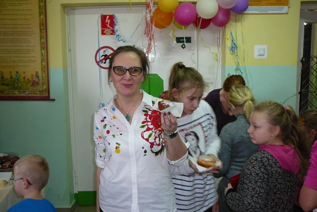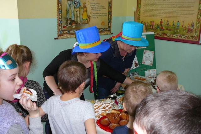 Tradycji stało się zadość. Podobnie jak w latach ubiegłych w Tłusty Czwartek w holu szkoły wyrosły jak grzyby po deszczu stragany. Każdy przyozdobiony i wypełniony tym ,co dla tego dnia charakterystyczne – pączkami i chrustami, między którymi znaleźć można było również rogaliki, sernik , owsiane ciasteczka , malutkie babeczki, serowe oponki. Drugoklasiści dla swoich klientów przygotowali niespodzianki- ci, którym dopisało szczęście oprócz zakupionego pączka otrzymywali czapkę lub maskę karnawałową.