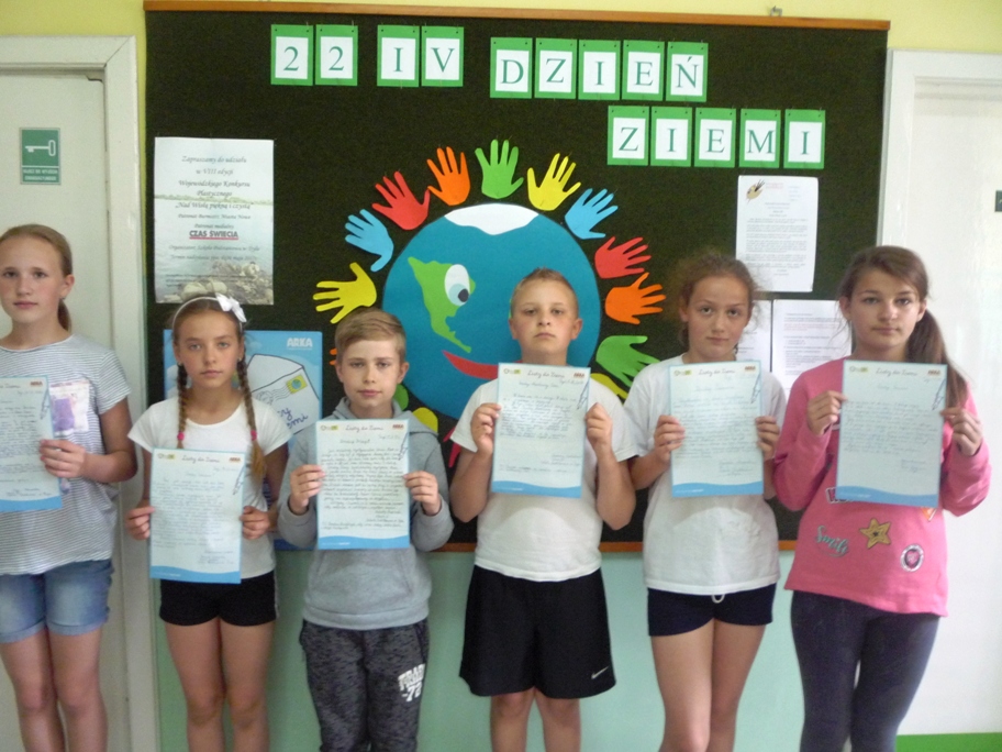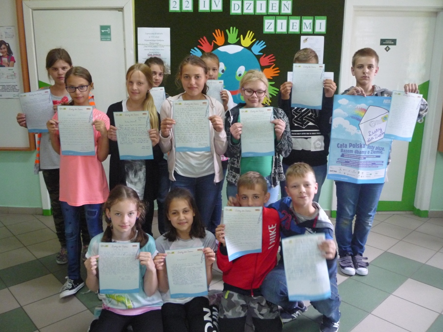 W dniu 19 maja 2017 r. klasa VI przygotowała happening z okazji „Dnia Ziemi”. Wędrowaliśmy przez wieś z plakatami i hasłami o tematyce ekologicznej. Cieszymy się, że nasz pomysł spotkał się z zainteresowaniem mieszkańców i młodszych kolegów. Większość uczniów pisała też „Listy do Ziemi”. Wierzymy, że nasze działania przyczynią się do dbałości o przyrodę.