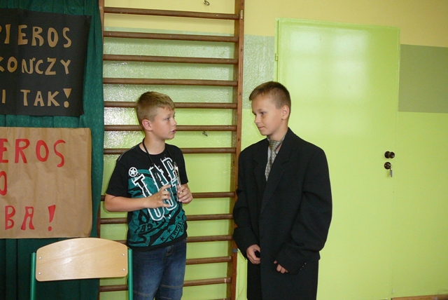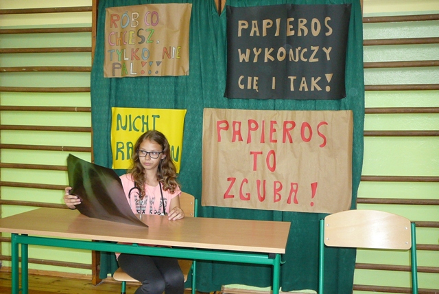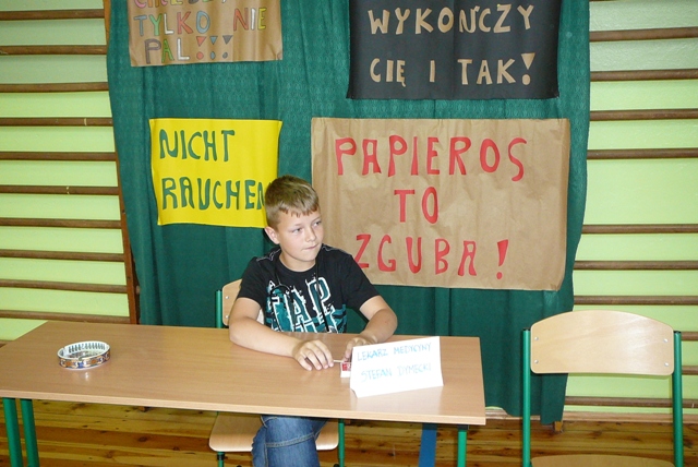 Dzień bez Papierosa zainicjowany został przez Światową Organizację Zdrowia. W naszej szkole już od kilku lat w ramach propagowania zdrowego stylu życia, odbywają się apele poświęcone szkodliwym skutkom palenia papierosów. W tym roku 31 maja uczniowie klasy piątej pod kierunkiem pani Katarzyny Muchowskiej przedstawili bardzo pouczającą inscenizację. Po jej obejrzeniu każdy z nas utwierdził się w przekonaniu, że nałóg palenia papierosów jest bardzo szkodliwy nie tylko dla osoby palącej, ale także dla osób, które w towarzystwie palaczy przebywają. Tragiczny los doktora Dymeckiego ,a także kłopoty ze zdrowiem głównego bohatera przedstawienia skutecznie odsunęły pokusę, by kiedykolwiek sięgnąć po papierosy.