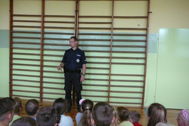 W ostatnim dniu nauki odwiedził nas dzielnicowy młodszy aspirant Leszek Banach z Komisariatu Policji w Nowem. Przypomniał o zasadach bezpiecznego poruszania się po drodze i bezpiecznego korzystania z kąpielisk. Zwrócił uwagę, byśmy z ograniczonym zaufaniem odnosili się do osób nieznajomych i pod żadnym pozorem nie dali się namówić na spróbowanie zabójczych dla organizmu dopalaczy czy narkotyków.