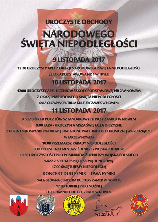 Z okazji Święta Niepodległości na terenie gminy Nowe odbędzie się wiele uroczystości upamiętniających odzyskanie przez Polskę niepodległości. O szczegółach informuje zamieszczony plakat (wystarczy kliknąć w ikonkę, która jest w lewym , górnym rogu tej wiadomości).