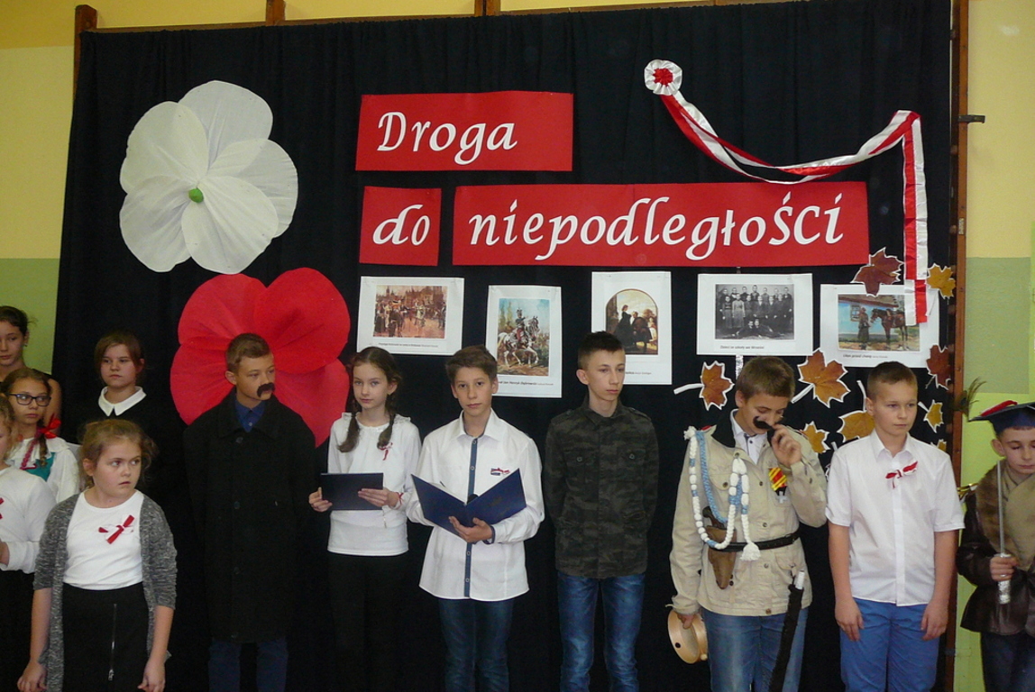Uczniowie klas IV-VI pod kierunkiem pani Krystyny Balewskiej przygotowali piękne wiersze patriotyczne, a także odegrali kilka scenek nawiązujących do ważnych wydarzeń z historii naszego kraju, szczególnie tych, które przyczyniły się do odzyskania przez Polskę niepodległości.