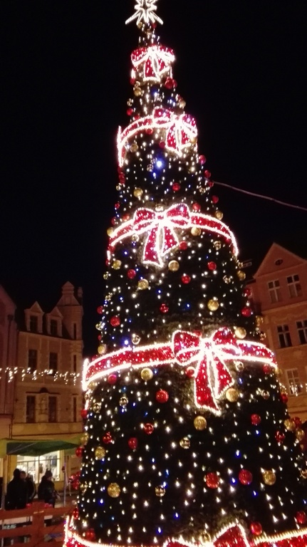 Potem udali się na rynek, gdzie dookoła rozświetlonej tysiącami lampek choinki rozstawione były kramy ze świątecznymi ozdobami i przysmakami, a na scenie odbywał się koncert kolęd i piosenek świątecznych.