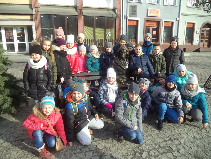 Na początku wycieczki poszliśmy zwiedzać Ogród Botaniczny. Były tam różne gatunki drzew takie jak: miłorząb chiński, dąb i platan. Po zwiedzaniu ogrodu udaliśmy się na spektakl pt. „Opowieść wigilijna”. Była w nim mowa o panu, który nie obchodził świąt Bożego Narodzenia . Jego nastawienie zmieniło się po tym, gdy przyszły do niego duchy, które pokazały mu, jak inni obchodzą święta i jakie one są piękne. Po spektaklu poszliśmy na pączki. Następnie zwiedzaliśmy miasto -rynek, kamienice. Na ławce widzieliśmy Mikołaja Kopernika, a potem wchodziliśmy na Wieżę Klimek. W trakcie zwiedzania zauważyliśmy willę, muzeum i spichlerze. Dowiedzieliśmy się, że Grudziądz ma swoją rzekę Trynkę. Potem poszliśmy na obiad, a na koniec każdy mógł kupić sobie pamiątkę w Centrum Informacji Turystycznej.