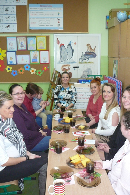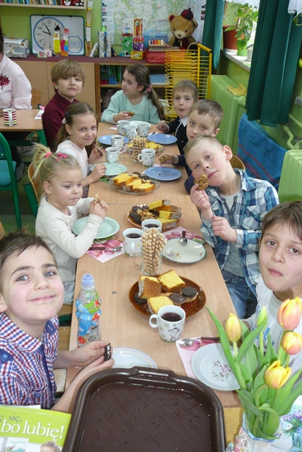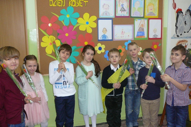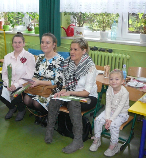 Z okazji dnia Kobiet drugoklasiści zaprosili swoje mamy. Panie przybyły w komplecie. Z uwagą wysłuchały krótkiego, wesołego przedstawienia. Bardzo dobrze rozwiązały także zadania, które zostały dla nich przygotowane. Dzieci wcześniej przeprowadziły z mamami wywiady , a potem ułożyły kilka zdań o tym, co mamy lubią, jak odpoczywają, czego słuchają… Każda mama doskonale rozpoznała charakteryzujący ją opis, mimo, że zdania były czytane przez losowo wybrane dzieci. Więcej kłopotu sprawiło mamom rozpoznanie siebie na wykonanych przez dzieci portretach, ale i z tym zadaniem się w końcu uporały. Chłopcy obdarowali wszystkie panie i koleżanki tulipanami, dla mam zostały przygotowane piękne laurki. Spotkanie przy herbacie i kawie zakończyło tą miłą uroczystość.