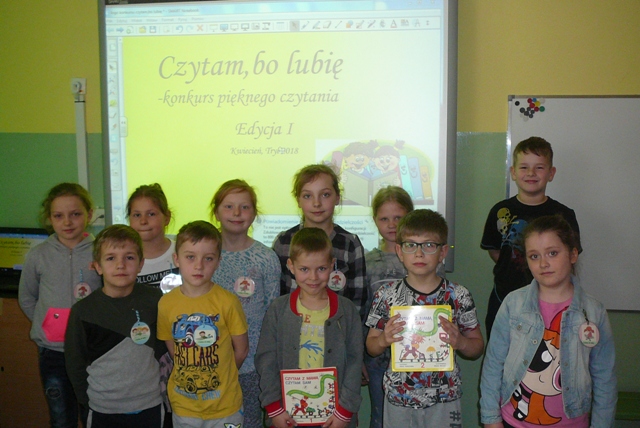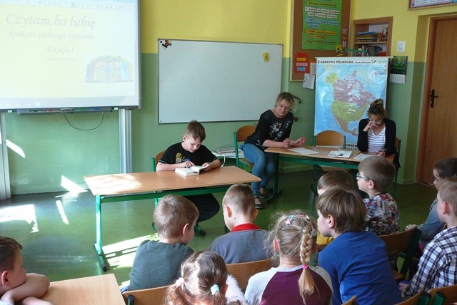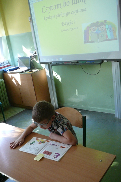 We wtorek 10 kwietnia odbyła się pierwsza edycja szkolnego konkursu „Czytam, bo lubię”. Wzięli w nim udział chętni uczniowie z klas I- III. Każdy z uczestników pięknie przeczytał wybrany przez siebie fragment prozy, który wcześniej przygotował. Jury i publiczność mieli okazję posłuchać przygód krasnala Hałabały, fragmentu książek „Przygody Filonka Bezogonka”, „Dzieci z Bullerbyn” , „Nie płacz, Koziołku". Przed uczniami z klasy II i III posawiono dodatkowe zadanie - każdy musiał przeczytać krótki tekst bez wcześniejszego przygotowania.Wszyscy czytali poprawnie i płynnie. Wielu uczniów zastosowało właściwą intonację głosu. Komisja konkursowa po uważnym wysłuchaniu popisów w pięknym czytaniu postanowiła wyróżnić następujące osoby: