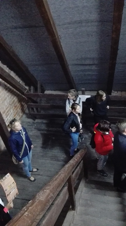 Krótkiego wykładu o historii kolegiaty wysłuchaliśmy w skupieniu, a potem udaliśmy się na kościelną wieżę. Wejście na nią dostarczyło sporo emocji, ponieważ prowadziły tam wąskie, strome schody. Po drodze mieliśmy okazję zobaczyć stare miechy organowe i zewnętrzne ściany świątyni tuż pod jej dachem. Po pokonaniu ostatnich stopni schodów naszym oczom ukazały się trzy dzwony, z których najstarszy pochodził z 1482 roku. A potem mogliśmy oglądać panoramę Grudziądza i okolic z wysokości kościelnej wieży. Widok był zupełnie wyjątkowy. Z jednej strony Klimek, Wisła, Biała Karczma, z drugiej most, dachy kamienic… Kiedy nacieszyliśmy oczy cudnymi krajobrazami, poszliśmy na chór – prospekt organowy i ponad tysiąc piszczałek zrobiły na nas spore wrażenie.