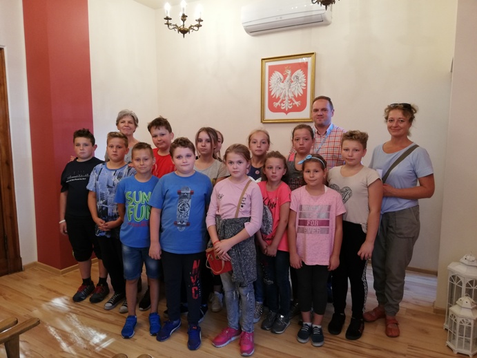 Zwiedzanie Urzędu Gminy zaczęliśmy od spotkania z panem wiceburmistrzem Zbigniewem Lorkowskim w sali posiedzeń. Pan opowiadał o pracy radnych, opowiadał też o pracy urzędu. Byliśmy w gabinecie burmistrza, w którym widzieliśmy bardzo dużo dokumentów. Następnie wstąpiliśmy do sekretariatu i podziękowaliśmy za poczęstowanie wodą (to był upalny dzień). Na samym końcu zwiedzaliśmy salę ślubów. To piękna, wystrojona sala. Najbardziej podobał nam się łańcuch, który ubiera urzędnik podczas uroczystości ślubnej. Na koniec zjedliśmy lody i wróciliśmy autobusem szkolnym do domu.