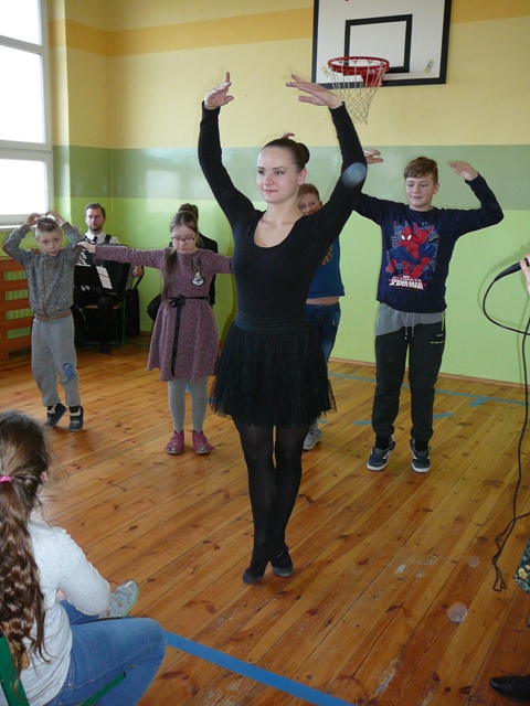 Przedwczoraj mieliśmy okazję po raz kolejny gościć w progach naszej szkoły artystów z Filharmonii Pomorskiej w Bydgoszczy. Tym razem zaprosili nas do krainy baletu. Znamy już odpowiedzi na pytania, czym są pointy, paczka… Mieliśmy okazję posłuchać muzyki rosyjskich kompozytorów, zobaczyć taneczne popisy baletnicy. Niektórzy z nas spróbowali nawet nauczyć się kilku podstawowych baletowych pozycji. Wysłuchaliśmy także operowej arii i zaśpiewaliśmy wspólnie, przy akompaniamencie akordeonu, popularną rosyjską piosenkę. Kolejne spotkanie już za miesiąc. W marcu odbędziemy muzyczną podróż do Hiszpanii.
