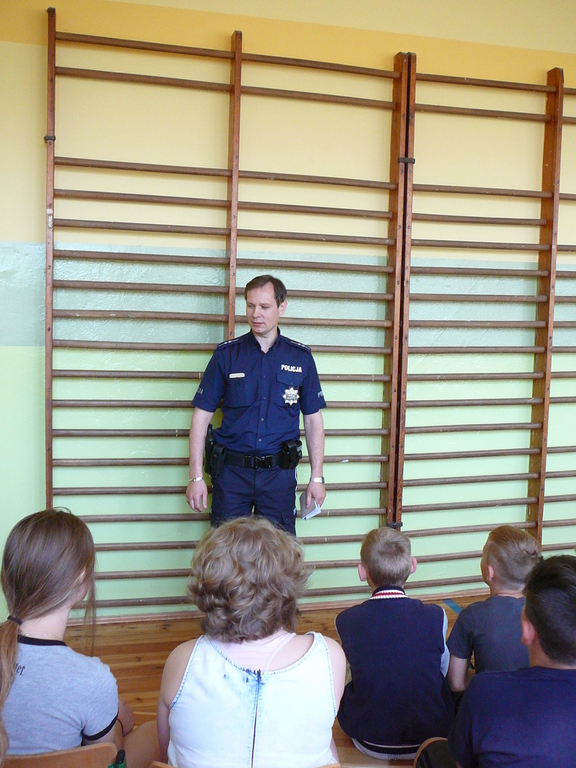 Dnia 3 czerwca odbyło się spotkanie z dzielnicowym - panem Leszkiem Banachem. Klasy I - VIII zebrały się w sali gimnastycznej, aby porozmawiać o niebezpieczeństwach zagrażających naszemu życiu. Policjant przestrzegł nas przed zażywaniem substancji takich jak narkotyki czy dopalacze i uświadomił do czego to prowadzi. Poza tym opowiedział nam pokrótce jak postępować w sytuacjach, kiedy znajdziemy człowieka w niebezpieczeństwie oraz jak powinniśmy się zachować, aby uratować jego życie bądź zdrowie. Takie spotkania są bardzo ważne, gdyż uświadamiają młodemu człowiekowi, że trzeba być ostrożnym i uczą jak postępować, by nie narazić się na konflikt z prawem.