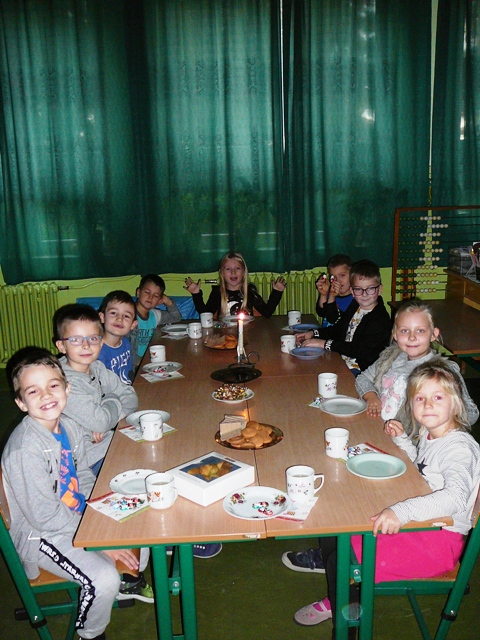 Zasłonięte okna, zapalona świeczka – bardzo nastrojowo było podczas andrzejkowego spotkania u pierwszaków. Pyszne rogaliki, które w środku miały karteczkę w wróżbą, były smakowitym początkiem wesołej zabawy. Dzieci nakłuwały serca, ustawiały buty, kręciły butelką, zaglądały pod kubeczki, a wszystko po to, aby dowiedzieć się, co będzie się działo w przyszłości. Oczywiście wszyscy podeszli do tych andrzejkowych zabaw z przymrużeniem oka.