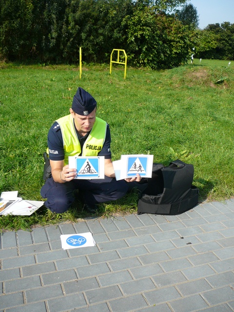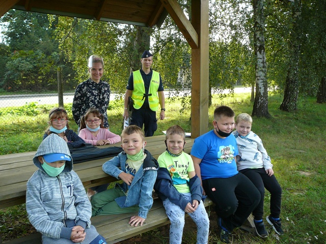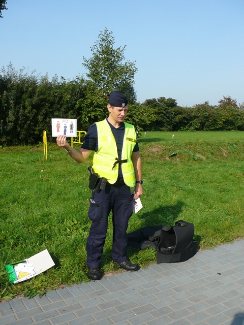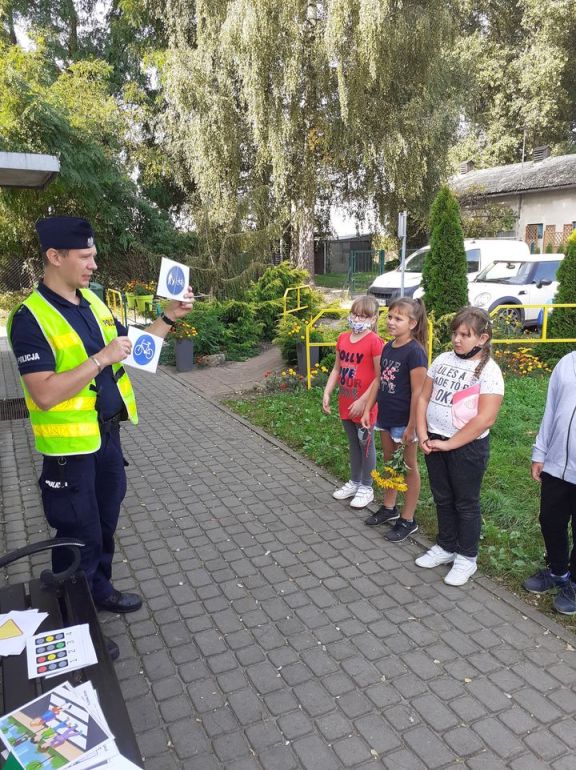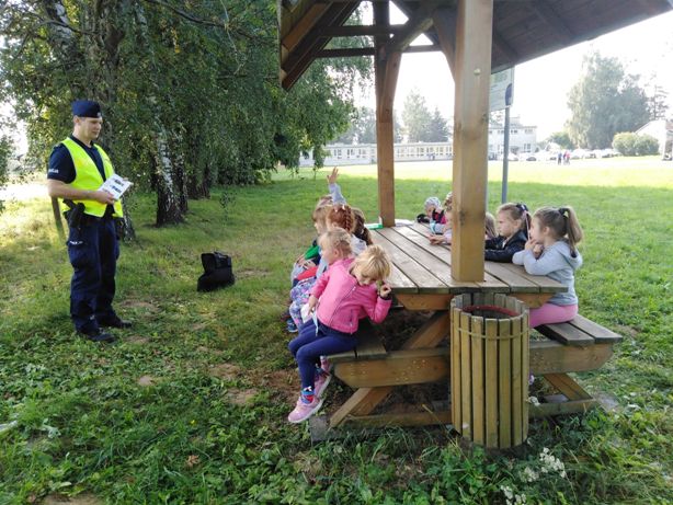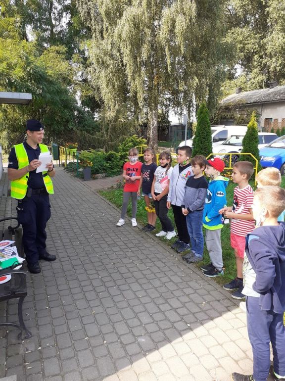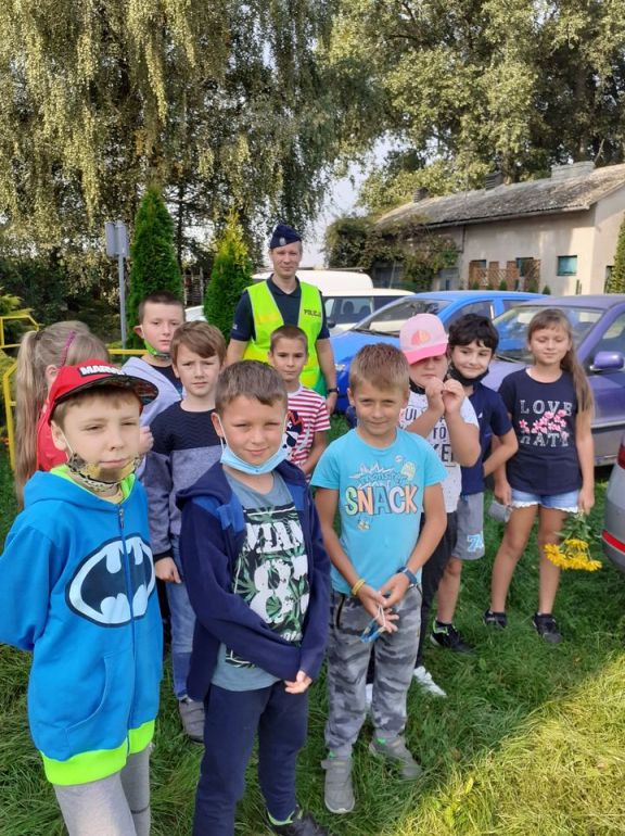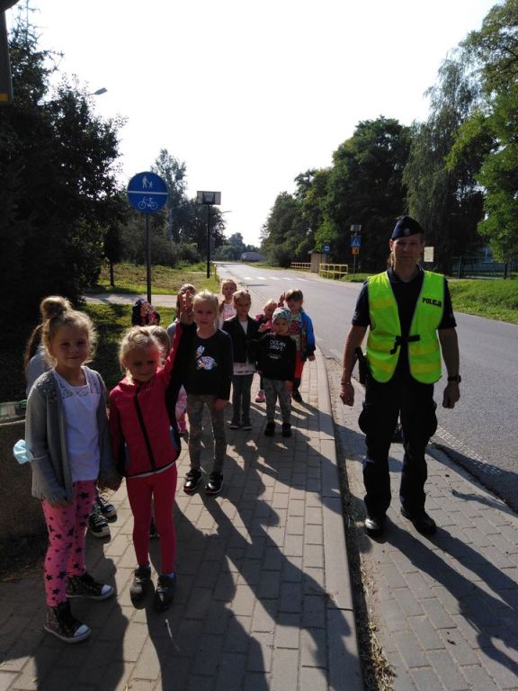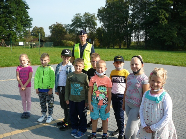 We wtorek 15 września uczniowie klas 0-III spotkali się z policjantem. Aspirant pan Leszek Banach przypomniał najmłodszym uczniom zasady bezpiecznego poruszania się po drodze. Pokazał im ilustracje przedstawiające niebezpieczne sytuacje na drodze, których uczestnikami były dzieci. Sprawdził , czy uczniowie znają podstawowe znaki drogowe. Przypomniał o konieczności noszenia znaczków lub kamizelek odblaskowych. Przedszkolaki i uczniowie klasy pierwszej pod czujnym okiem pana dzielnicowego ćwiczyli bezpieczne przechodzenie po pasach.