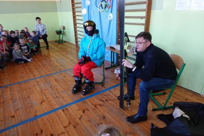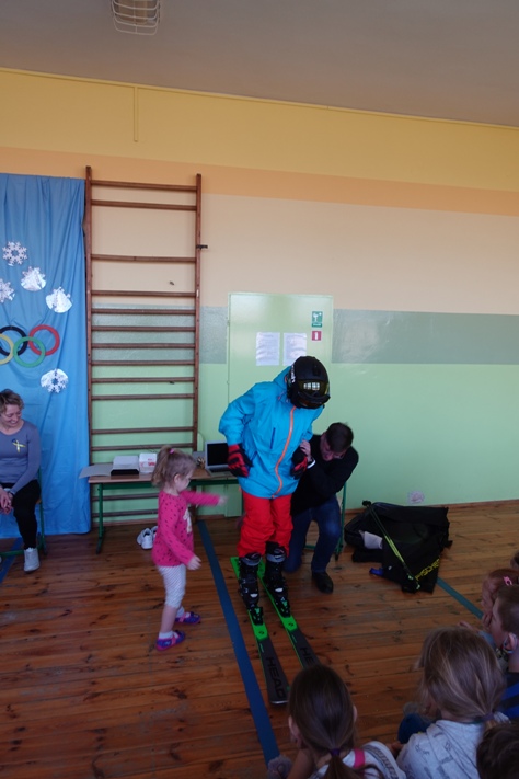 Potem wszystkich czekała niespodzianka. Ksiądz Damian opowiedział o swojej pasji, którą jest jazda na nartach. Wszyscy z ogromną ciekawością przyglądali się narciarskiemu ekwipunkowi. Mogliśmy zobaczyć profesjonalny strój narciarski, kask, gogle, rękawice, kijki… Jednak największe zainteresowanie wzbudziły narciarskie buty i oczywiście narty – każdy chciał ich dotkać.