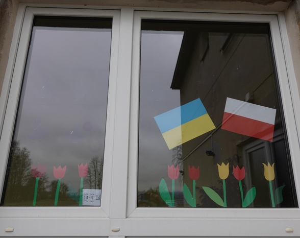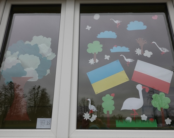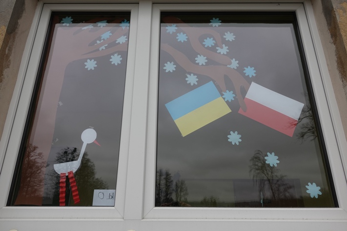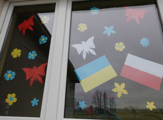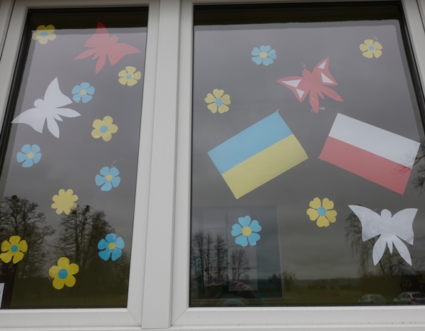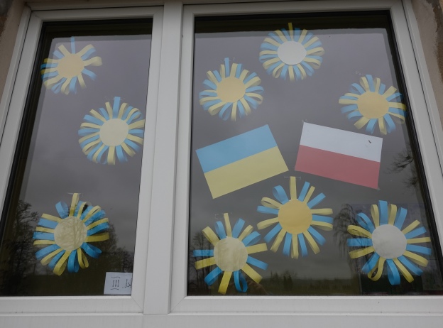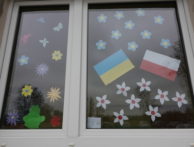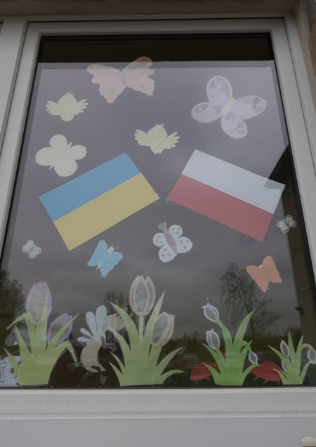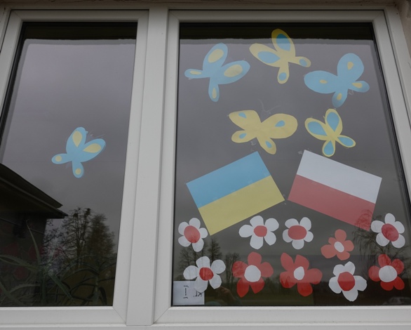 Wcześniej na szybach znalazły się flagi Ukrainy i Polski. Teraz toną one wśród kwiatów, motyli, biedronek.