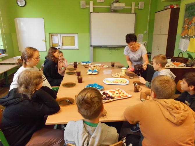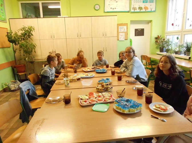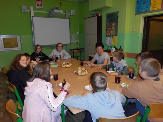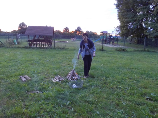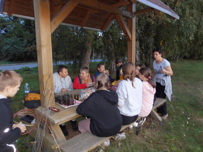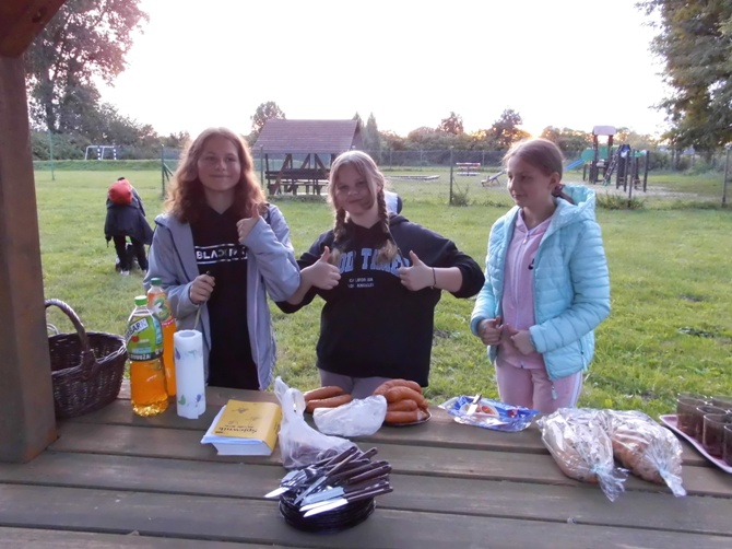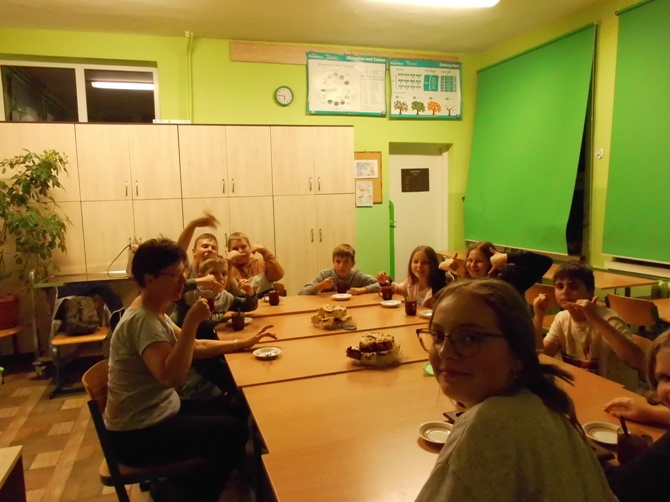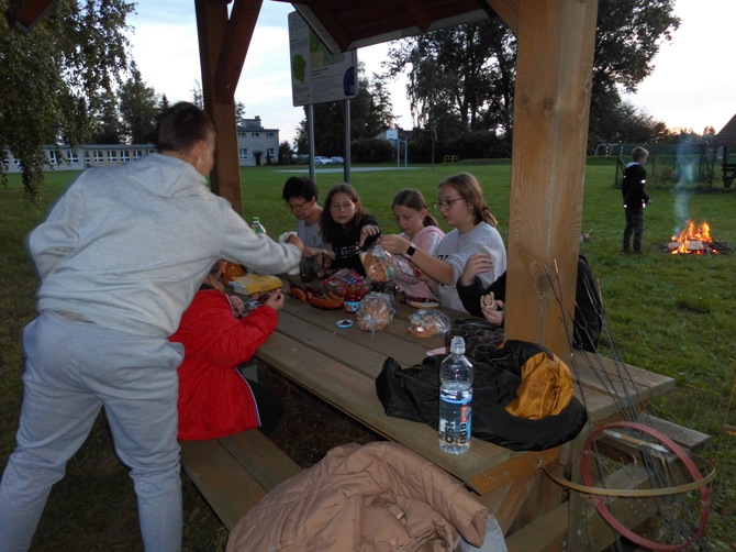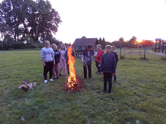 Wieczorem z 23 na 24 wrzesnia odbyło się w naszej szkole nocowanie dla chętnych uczniów z klas 6-8 pod opieką wychowawczyń. Rozpoczęliśmy ogniskiem i pieczeniem kiełbasek i chleba, potem śpiewaliśmy piosenki przy ognisku i opowiadaliśmy sobie dowcipy oraz zjedliśmy pyszne ciasto – murzynka upieczonego przez Martynę. Następnie udaliśmy się do szkoły, gdzie dalej jedliśmy, tym razem przepyszną drożdżówkę upieczoną przez mamę Adriana. Później wspólnie oglądaliśmy film. Nocowaliśmy w śpiworach i na materacach. Rano zjedliśmy śniadanie przygotowane przez dziewczyny z produktów, które każdy przyniósł i zjedliśmy kolejne ciasto – biszkopt z galaretką i owocami upieczony przez Julkę. Na koniec zostało nam jeszcze sprzątanie szkoły i powrót do domu. Spędziliśmy czas wspólnie i wesoło na integracji i zabawie.