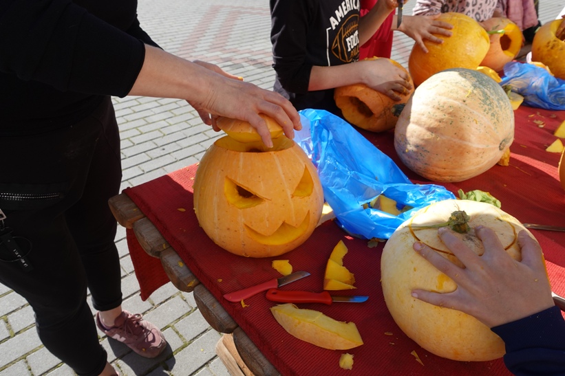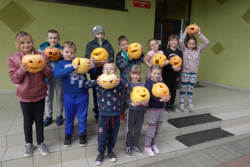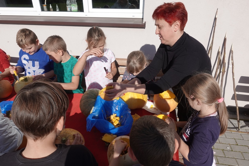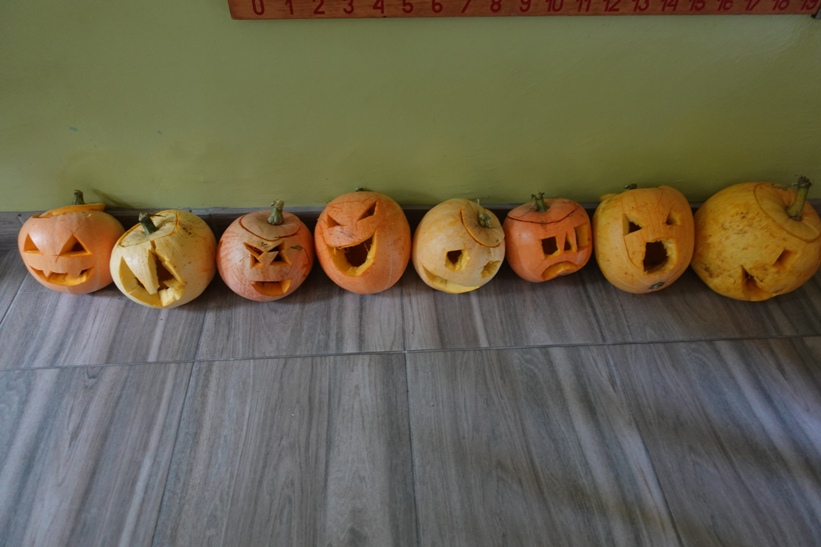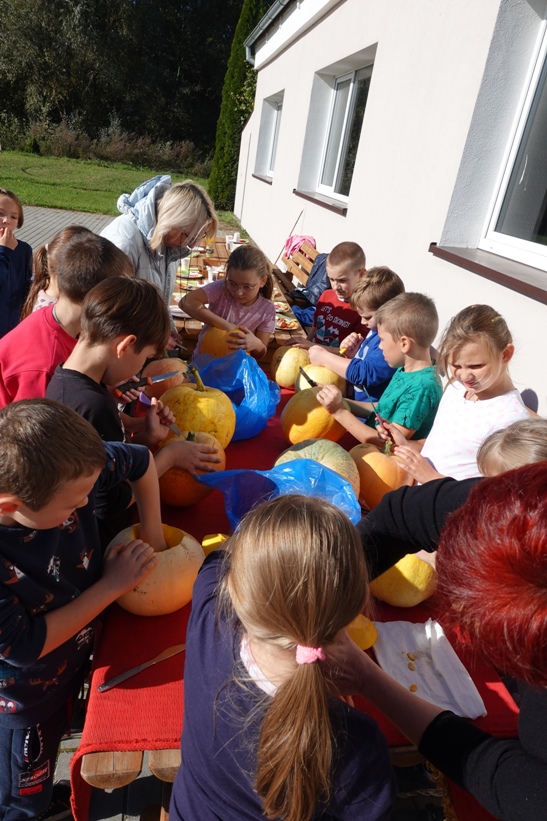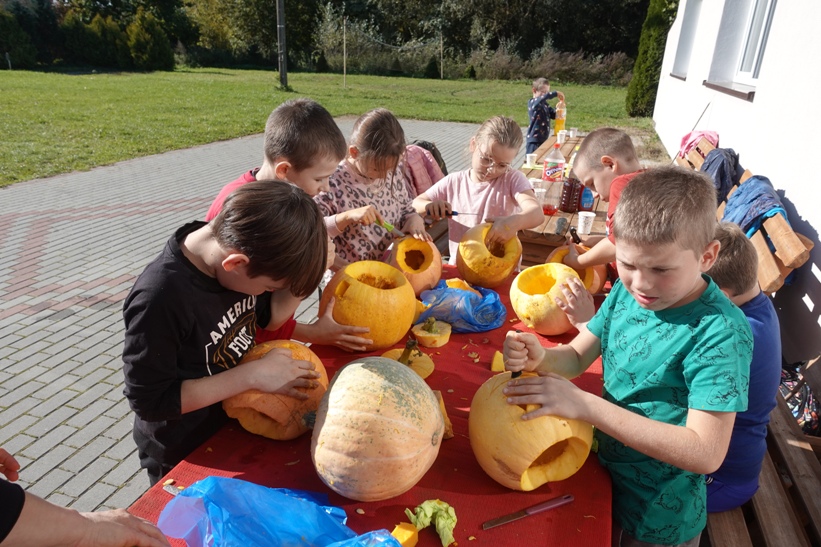Po relaksie i wypoczynku przyszedł czas na pracę. Każdy uczeń otrzymał dorodną dynię, z której wyrzeźbił piękną, a czasami „straszną” buzię. Dyniowe głowy ozdobiły salę lekcyjną.
