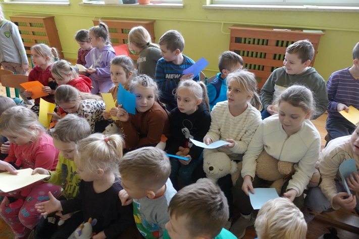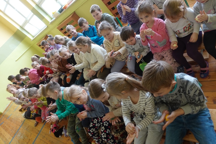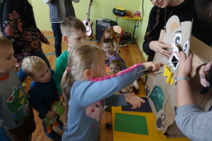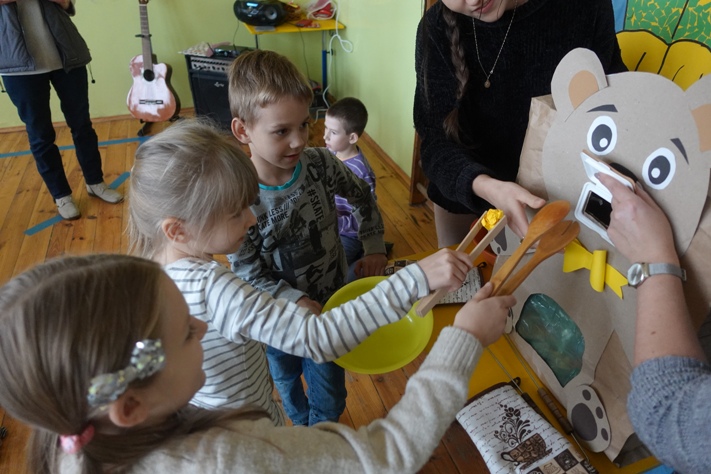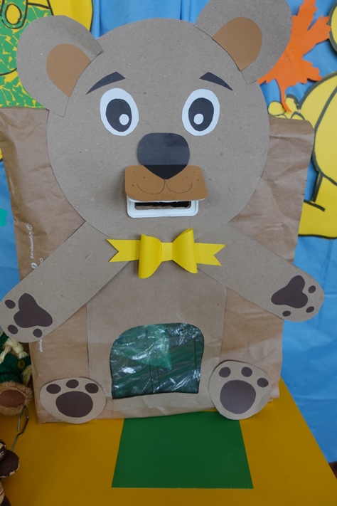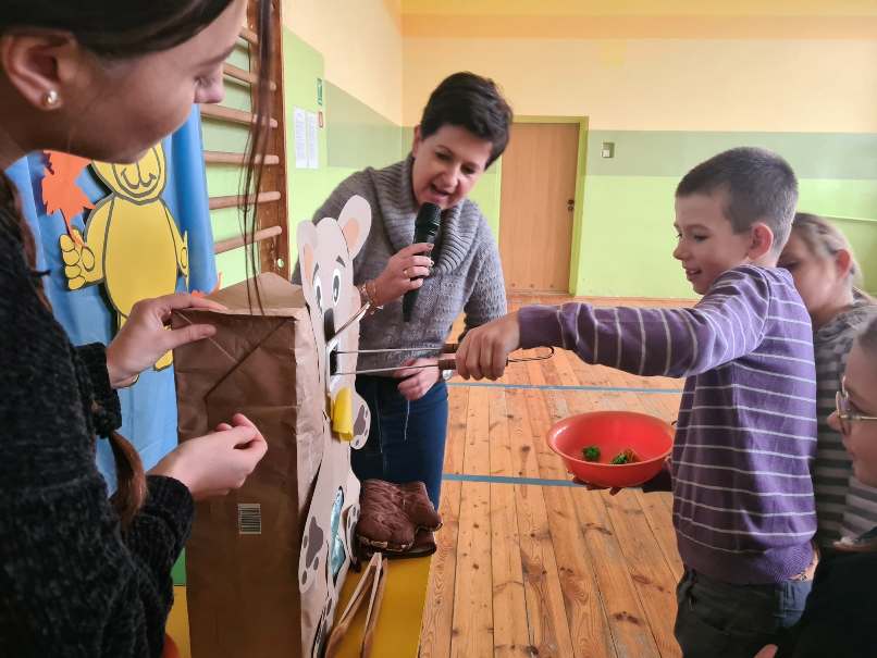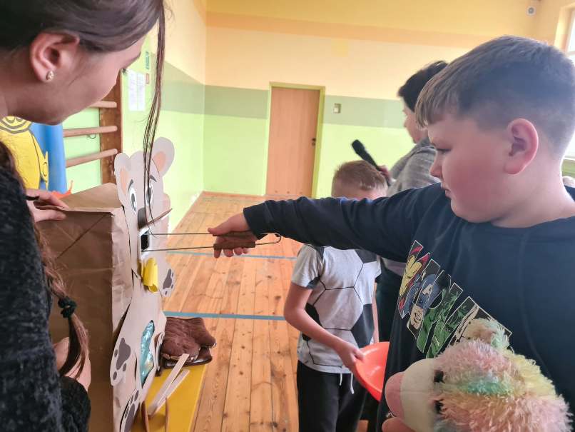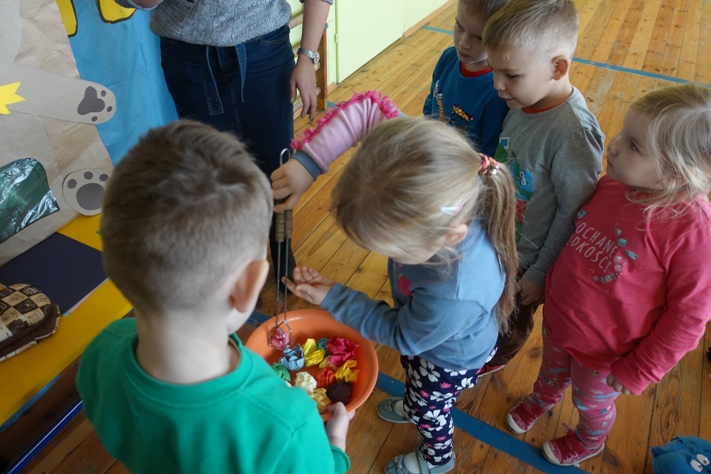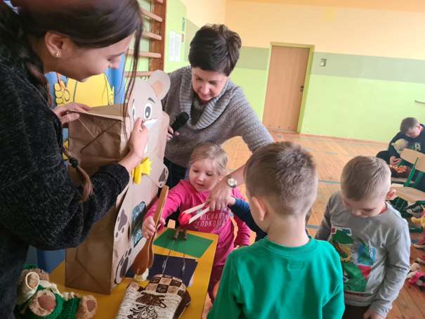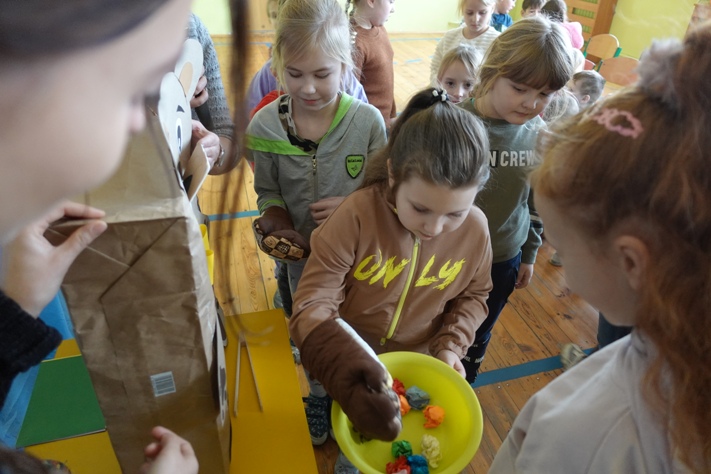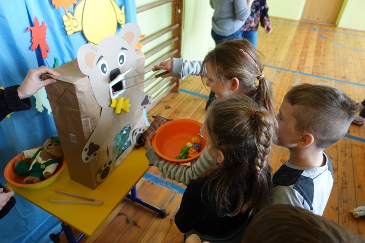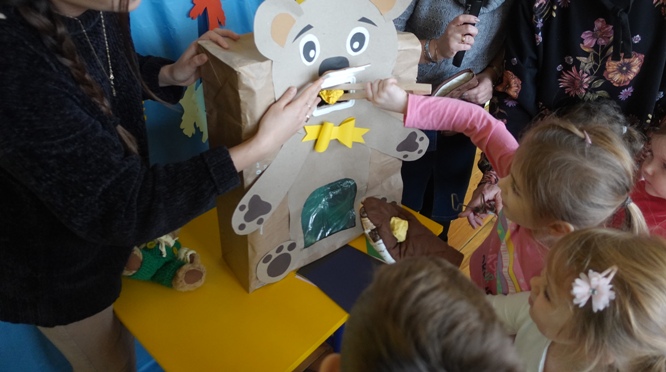 o niedźwiedziu brunatnym, po czym zadali słuchaczom pytania dotyczące życia niedźwiedzi. Każdy, kto udzielił poprawnej odpowiedzi, w nagrodę otrzymał naklejkę. Z kolei trzecioklasiści przedstawili zagadki o różnego rodzaju misiach – niektóre były dość trudne, ale wszystkie udało się rozwiązać. Zabawa logopedyczna, nawiązująca w swojej treści do bohatera święta oraz „karmienie” kartonowego niedźwiadka pozwoliły dzieciom rozruszać ręce i buzie. Na koniec każde dziecko przygotowało dla swojej maskotki urodzinową muchę. Nie zabrakło słodkiego „co nieco” i wspólnego, pamiątkowego zdjęcia.