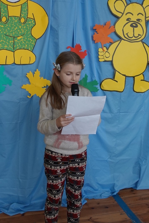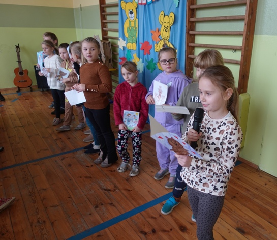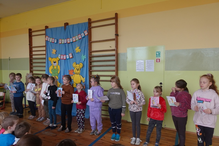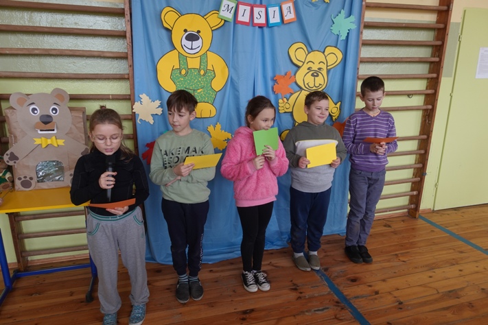 Najpierw wszyscy wysłuchali historii o tym, jak powstała maskotka pluszowego misia, którą pięknie przeczytała Patrycja z klasy pierwszej. Później, przy akompaniamencie gitary, chóralnie odśpiewana została piosenka „Jadą, jadą misie”. Następnie uczniowie klasy drugiej przeczytali ciekawostki