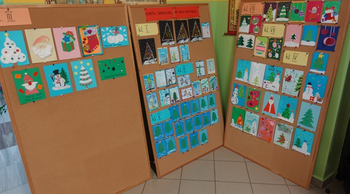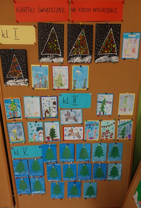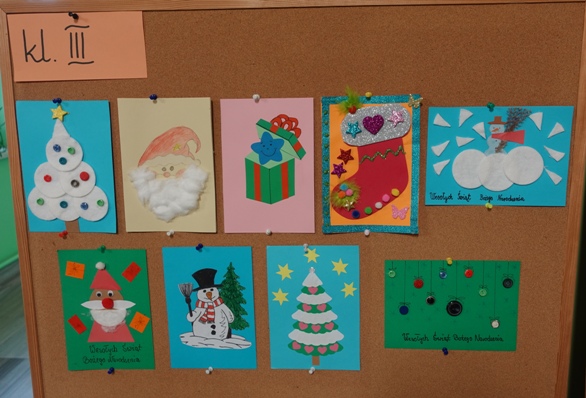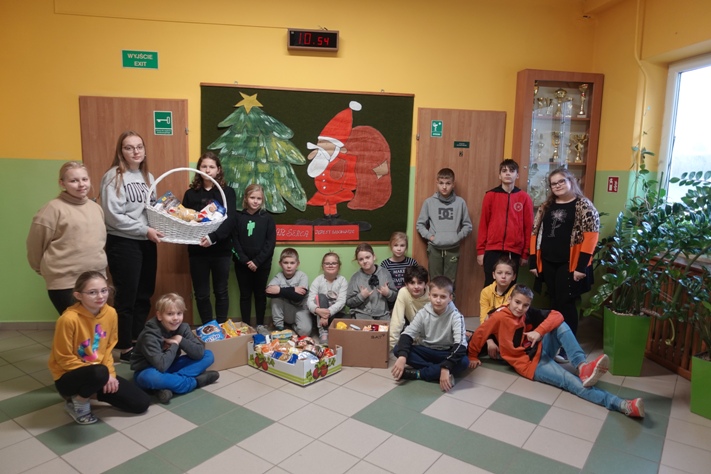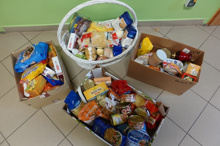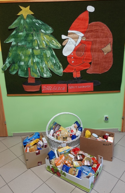 Zbieraliśmy produkty żywnościowe o długiej przydatności do spożycia. Wykonaliśmy także kartki bożonarodzeniowe, na których napisaliśmy życzenia świąteczne.