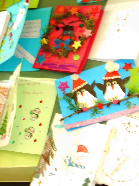 Uczniowie z klasy VII i VIII brali udział w konkursie „Die Weihnachtskarte” na wykonanie kartki świątecznej z życzeniami w j.niemieckim.