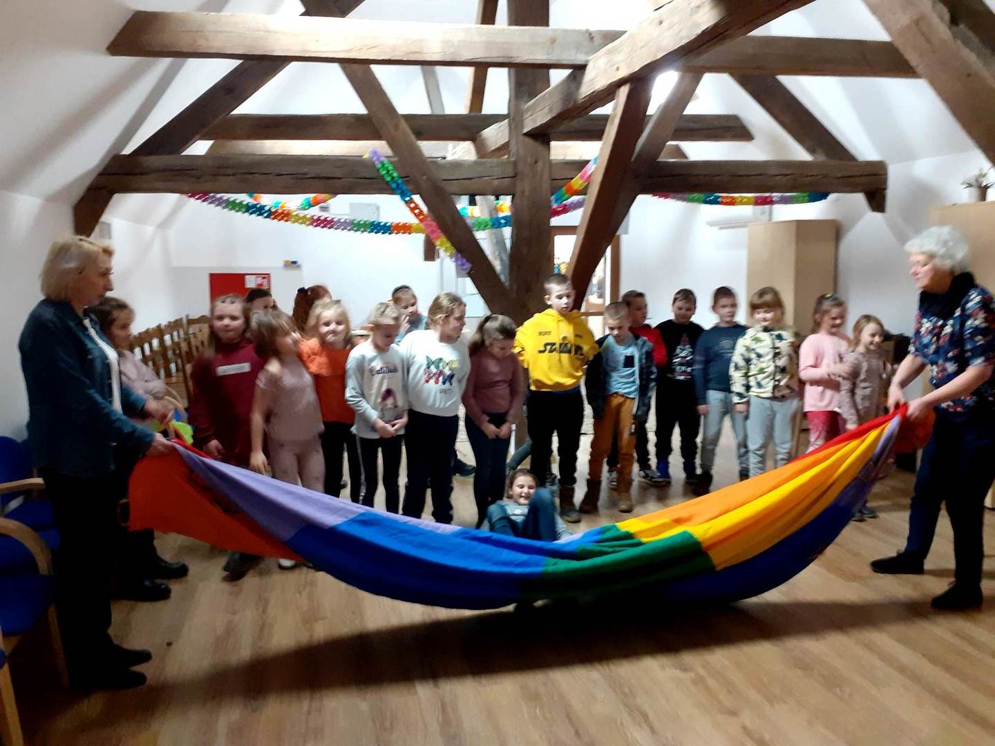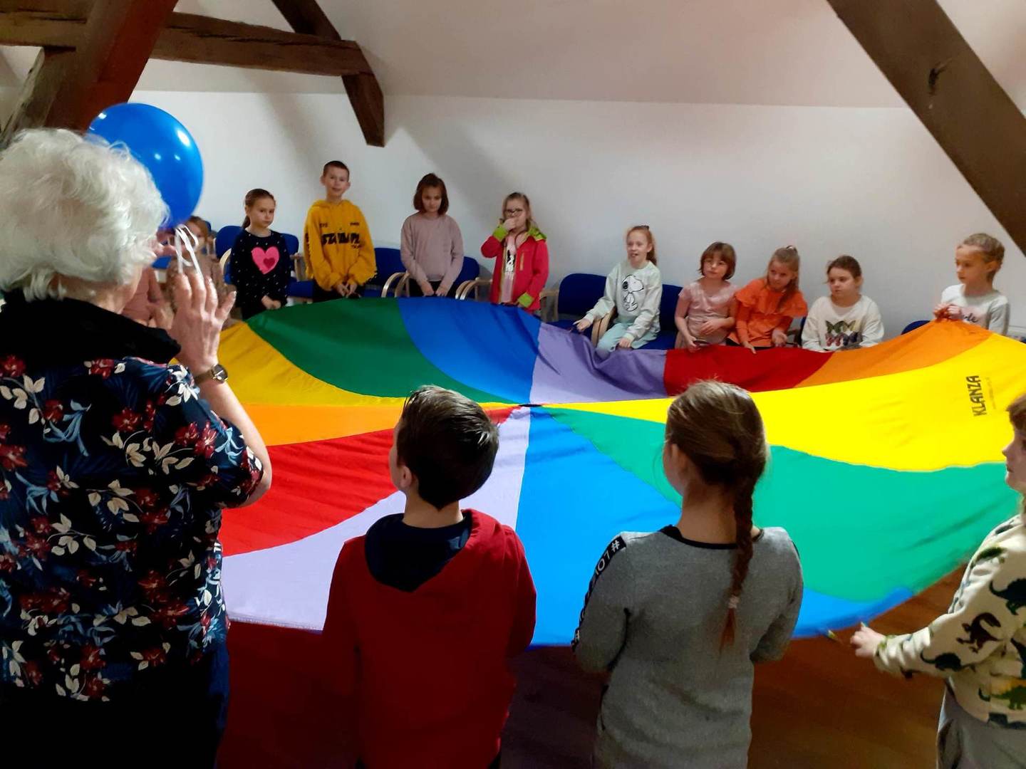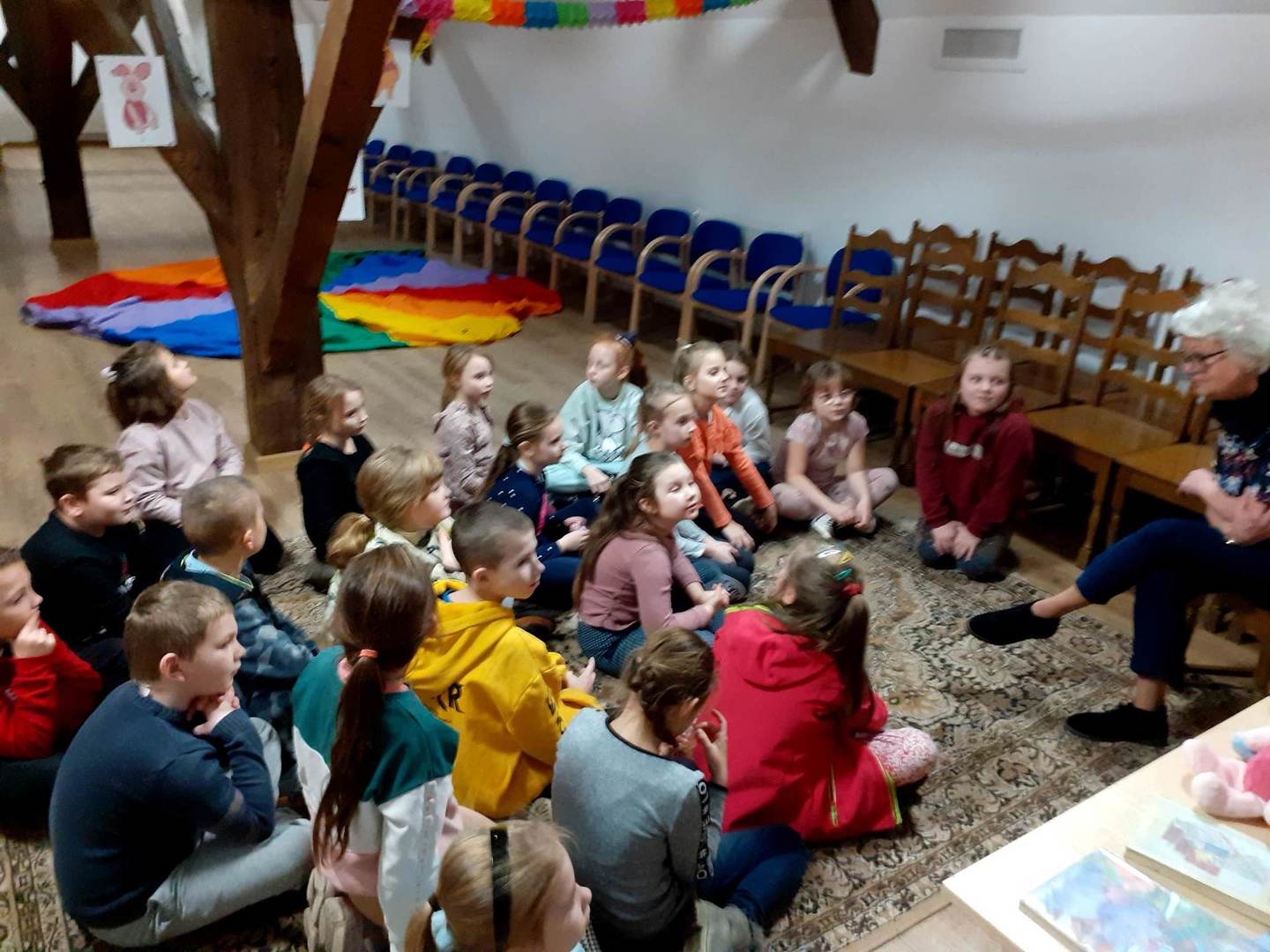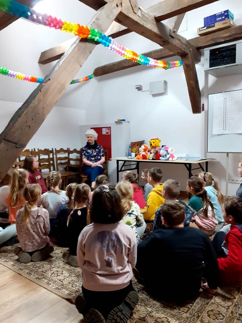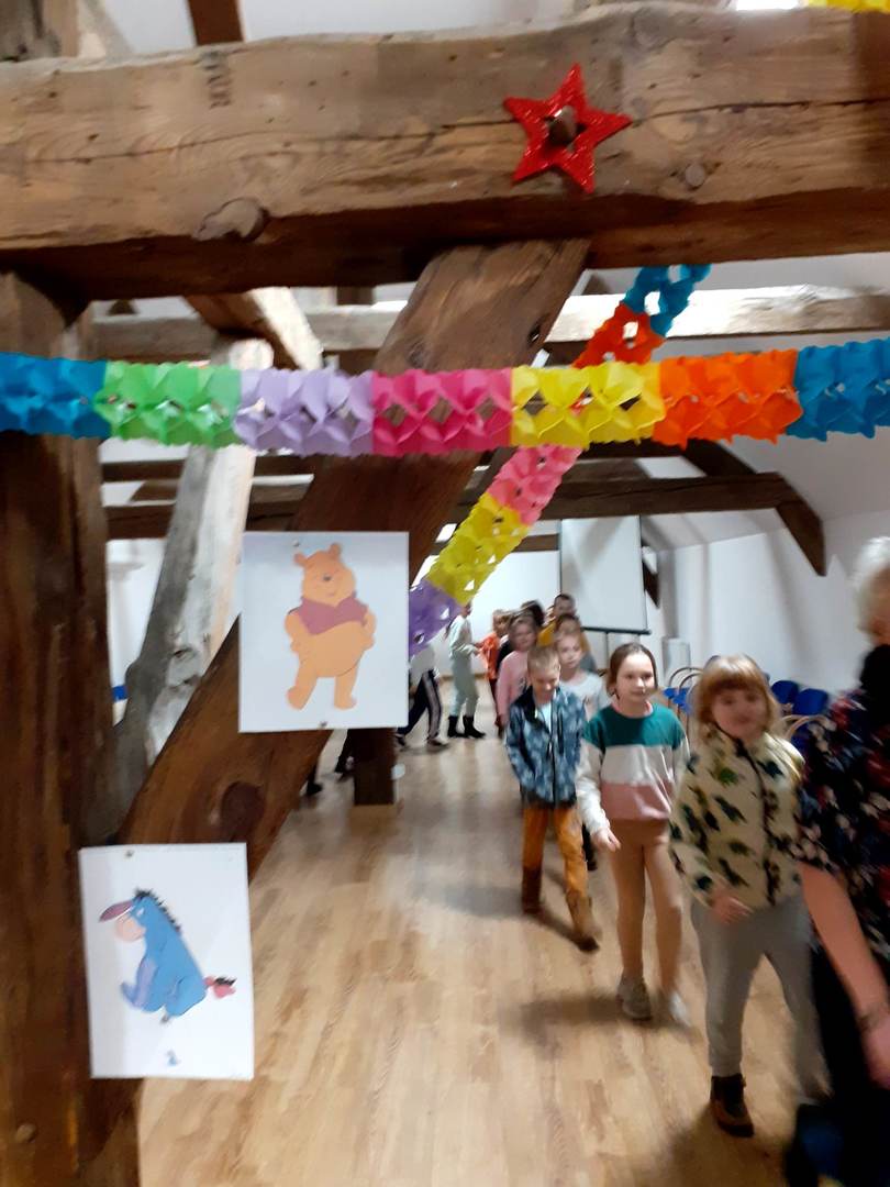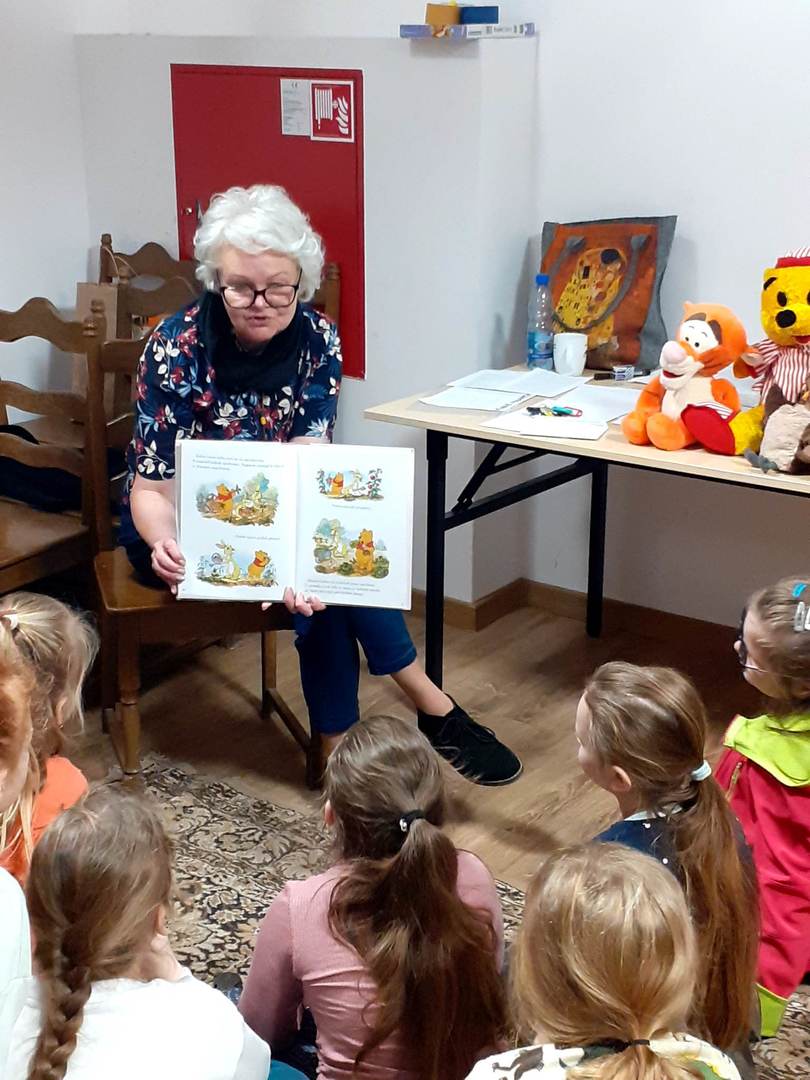 W poniedziałek 16 stycznia uczniowie kl II i III byli zaproszeni na urodziny Kubusia Puchatka do CK Zamek w Nowem. W imieniu Kubusia powitała nas pani Elżbieta Kucińska, która przybliżyła dzieciom postać sympatycznego misia. Opowiadała o nim ciekawostki i przeczytała jedną z jego wielu ciekawych przygód. Pani Ela zachęcała dzieci do korzystania z miejskiej biblioteki, gdzie można wypożyczyć wiele książek o Kubusiu Puchatku, niektóre z nich mogliśmy obejrzeć. Później naszym zadaniem było rozwiązanie krzyżówki i zagadek, niektórych bardzo trudnych, ale wspólnymi siłami daliśmy radę. Dużo radości sprawiły dzieciom wspólne zabawy z chustą animacyjną i tańce przy muzyce. Kubuś Puchatek, choć wciąż tak samo młodziutki i kochany skończył już 96 lat - życzymy mu wszystkiego najlepszego!