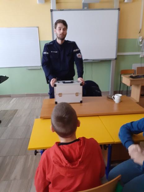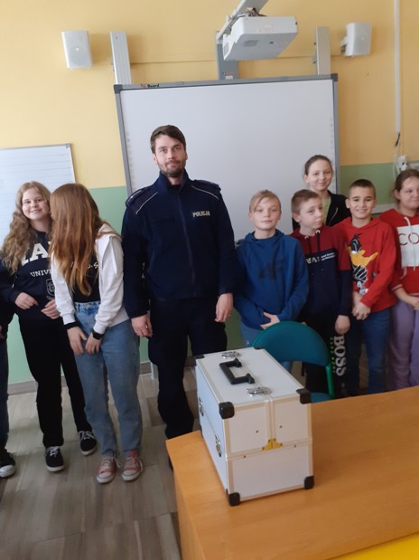 W poniedziałek (23.01.2023),odbyło się spotkanie z dzielnicowym, panem Maciejem Kamińskim. W spotkaniu wzięli udział uczniowie klasy VIII i VII. Pan policjant  zwrócił uwagę na  zachowanie bezpieczeństwa podczas zabaw w czasie ferii i bezpieczne poruszanie się po drogach. Mówił też o zabawach zimowych i zakazie wchodzenia na lód na rzekach i jeziorach. Pan Kamiński przypomniał nam o rozważnym zachowaniu w sieci. Oglądaliśmy zdjęcia obrazujące skutki zażywania narkotyków. Mogliśmy też obejrzeć saszetki z narkotykami i używkami przypominające zabawki lub przedmioty codziennego użytku. Spotkanie podobało nam się bardzo i przypomniało, że jesteśmy odpowiedzialni za swoje zachowanie.