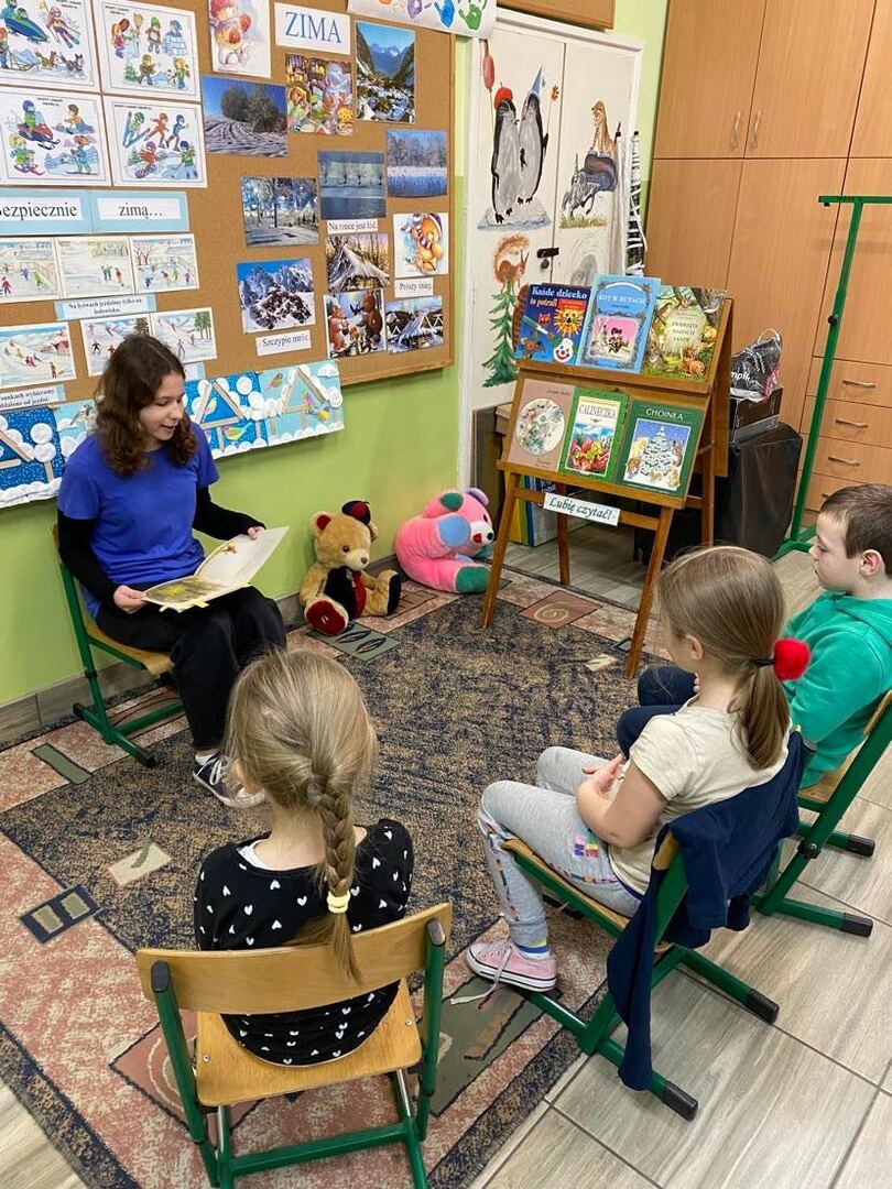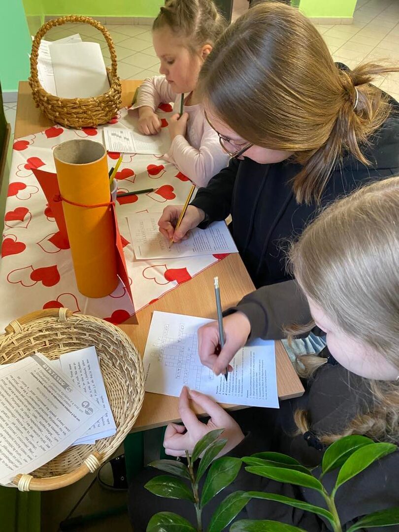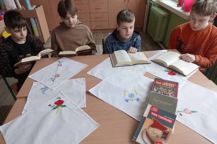 Kolejną propozycją dla uczniów był kącik językowy. Podczas przerw można było rozwiązywać różne rebusy, krzyżówki lub dyktanda, które wyłożone zostały na stoliku w holu szkolnym. Przez cały tydzień uczennice z klasy VIII czytały książki klasom 0-III. Ostatnią przedsięwzięciem było czytanie „Pana Tadeusza” Adama Mickiewicza podczas lekcji języka polskiego. Kilka  minut zajęć w klasach IV- VIII  było poświęcone na lekturę tej niezwykłej epopei narodowej.