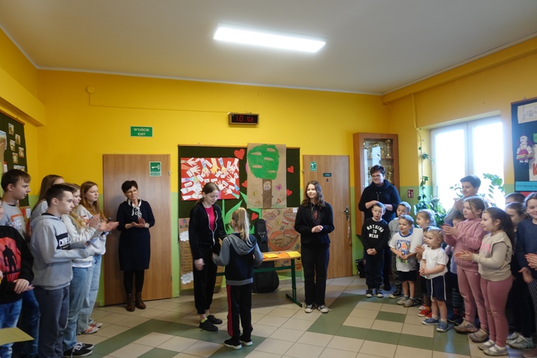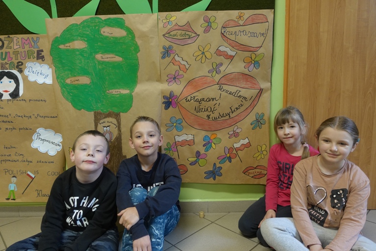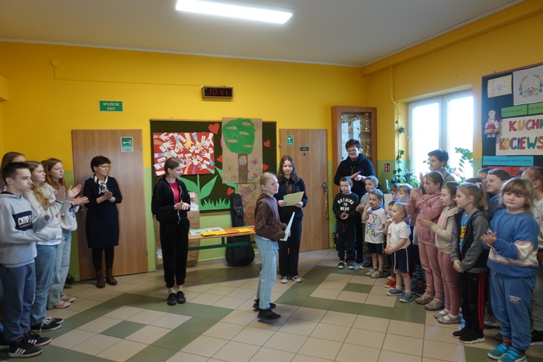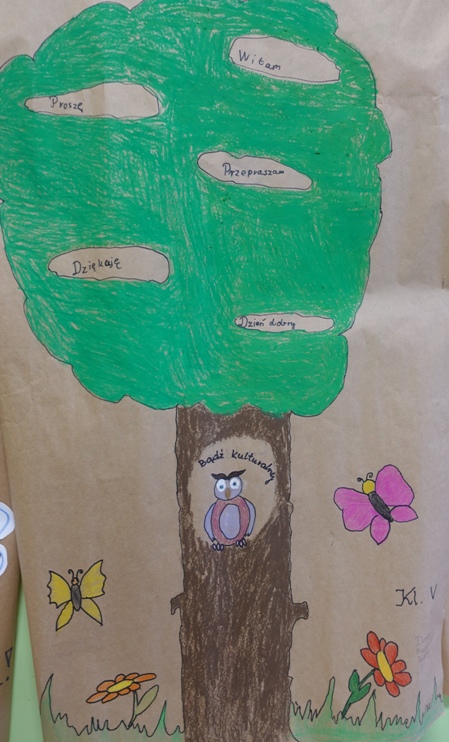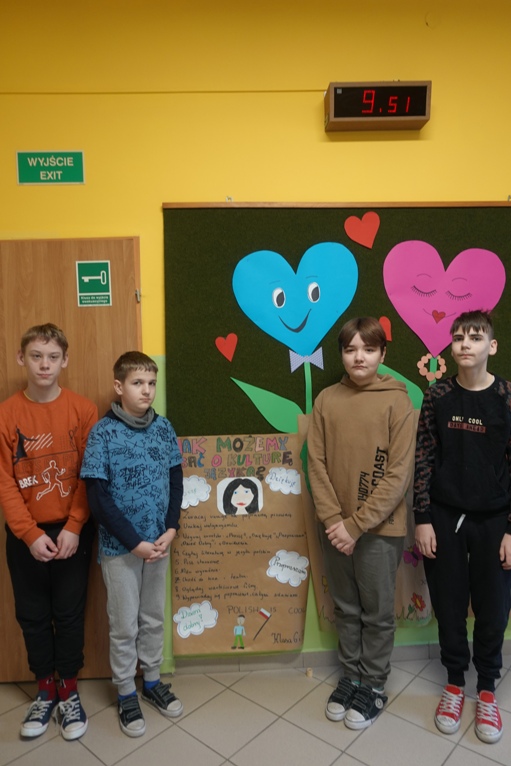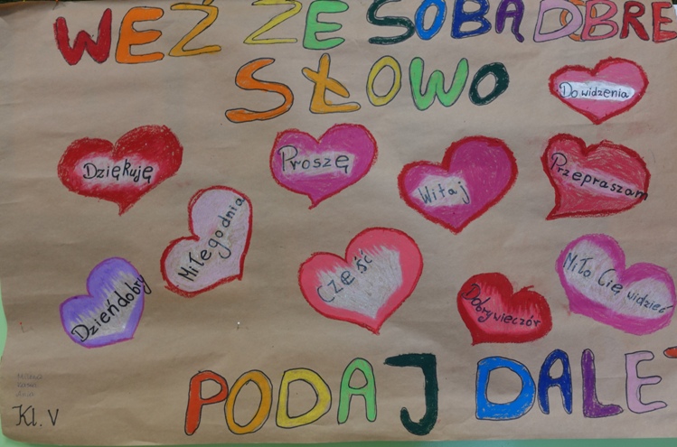 Kolejną aktywnością było zadanie plastyczne dla klas. Należało wykonać plakat pod hasłem „Mój język świadczy o mnie”. Jury składające się z pracowników szkoły dokonało wyboru najciekawszej pracy. I miejsce zajęła kl. VIII, II miejsce kl. II, na III miejscu znalazła się kl. I.