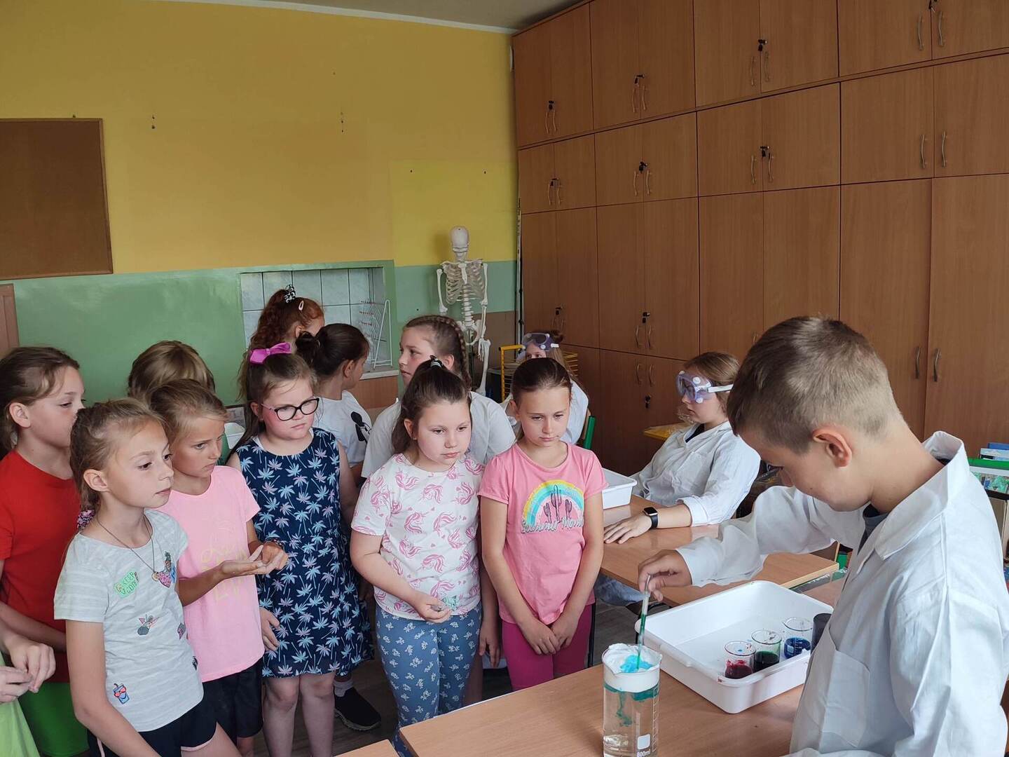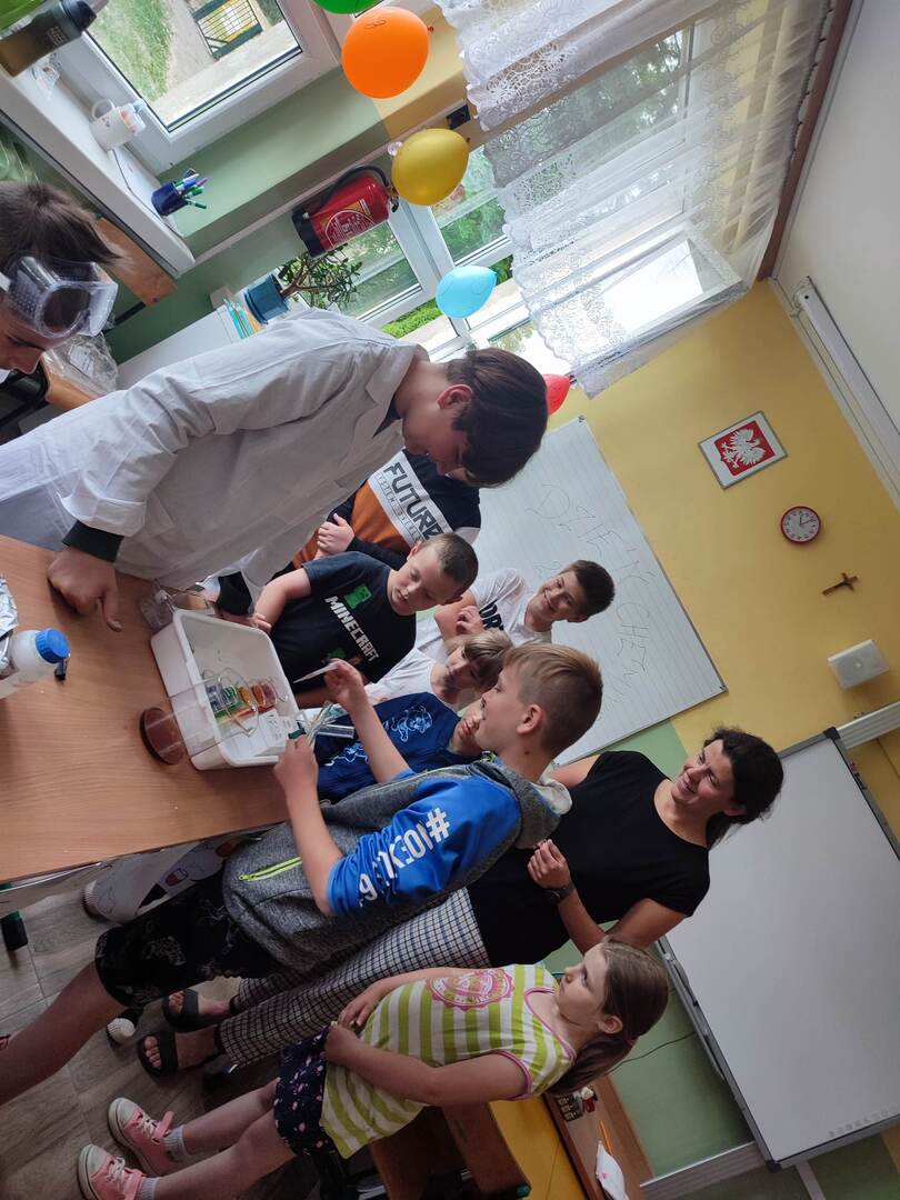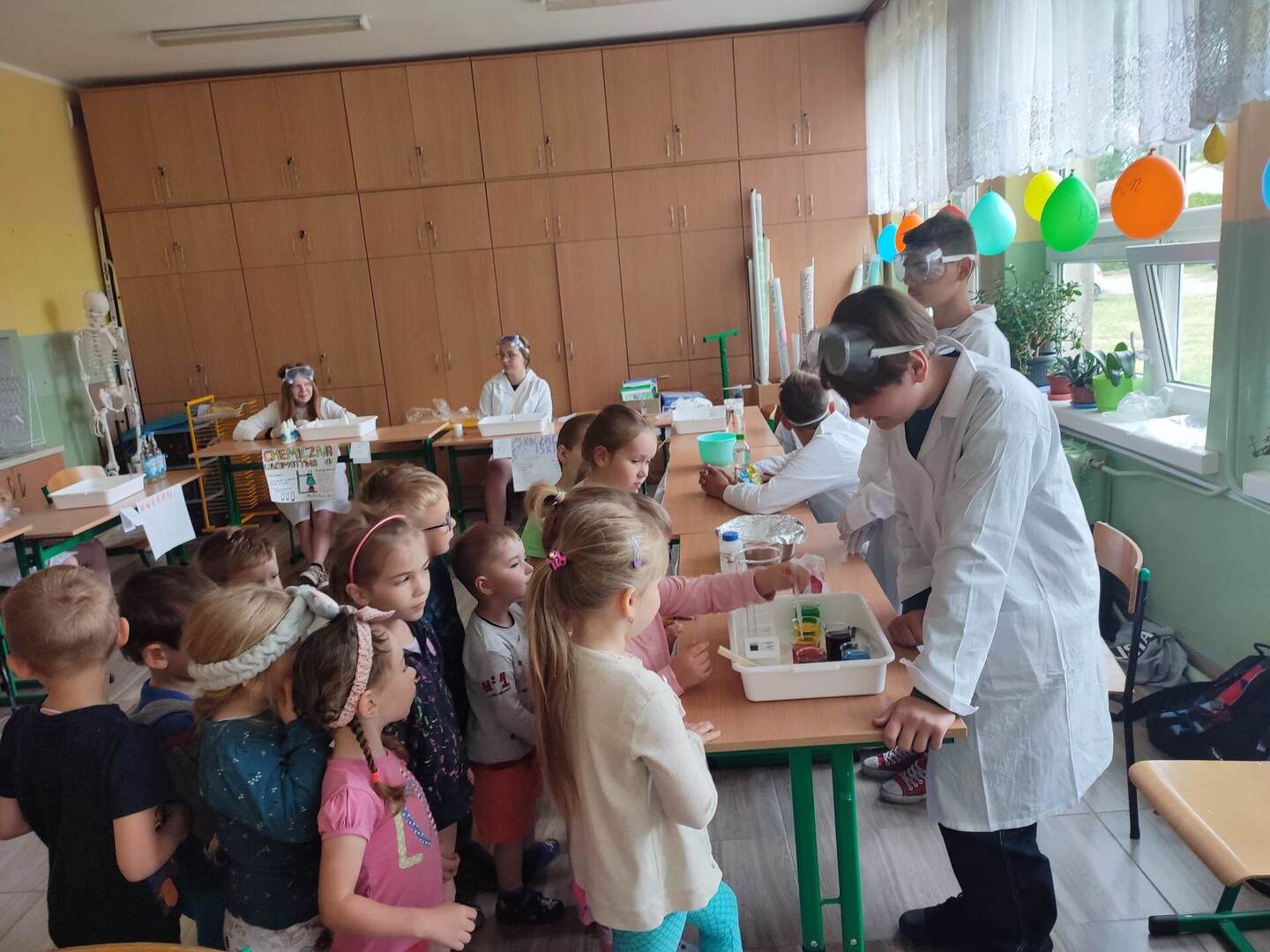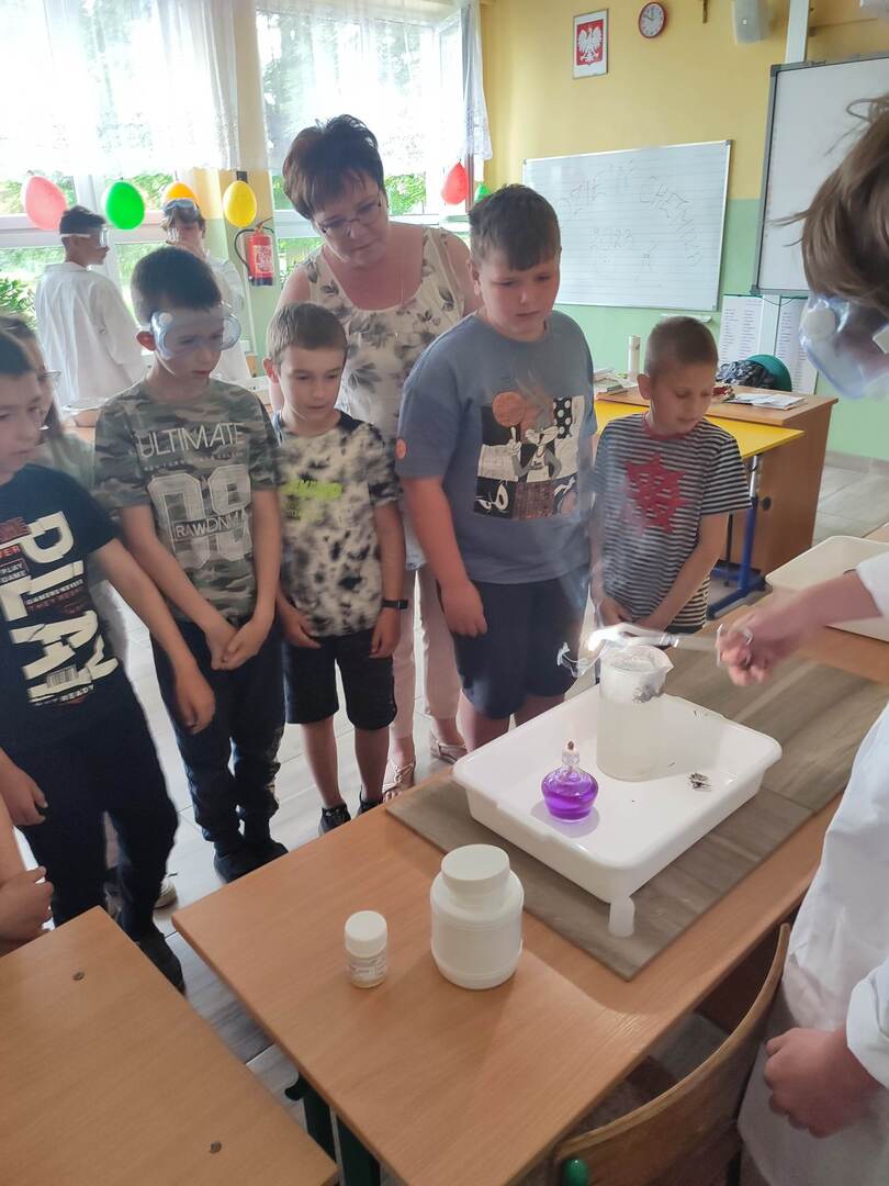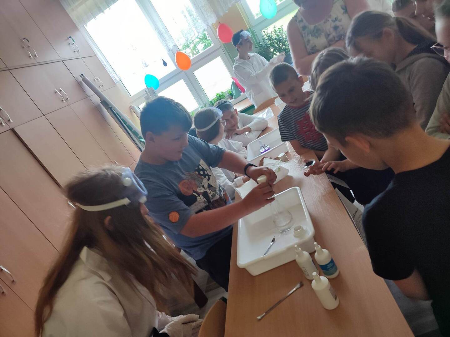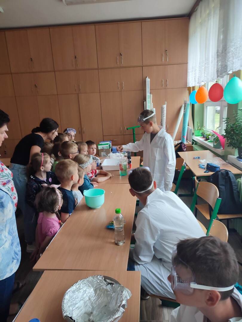 Dnia 13 czerwca 2023r. po raz pierwszy w naszej szkole odbył się Dzień Chemika. Uczniowie z klasy siódmej i ósmej pod okiem nauczyciela chemii przygotowali doświadczenia chemiczne dla swoich kolegów z klas młodszych. W ten sposób chcieli zachęcić ich do nauki chemii oraz pokazać piękno, mądrość i niezliczone tajemnice, jakie kryje ta dziedzina nauk przyrodniczych. Uczniowie, wykonując doświadczenia, zaprezentowali umiejętności bezpiecznego posługiwania się wybranym sprzętem laboratoryjnym, odczynnikami chemicznymi oraz wyjaśniali przebieg procesów chemicznych zachodzących podczas doświadczeń. Pokazy chemiczne cieszyły się dużym zainteresowaniem zarówno wśród uczniów, którzy je wykonywali oraz tych, którzy je oglądali.