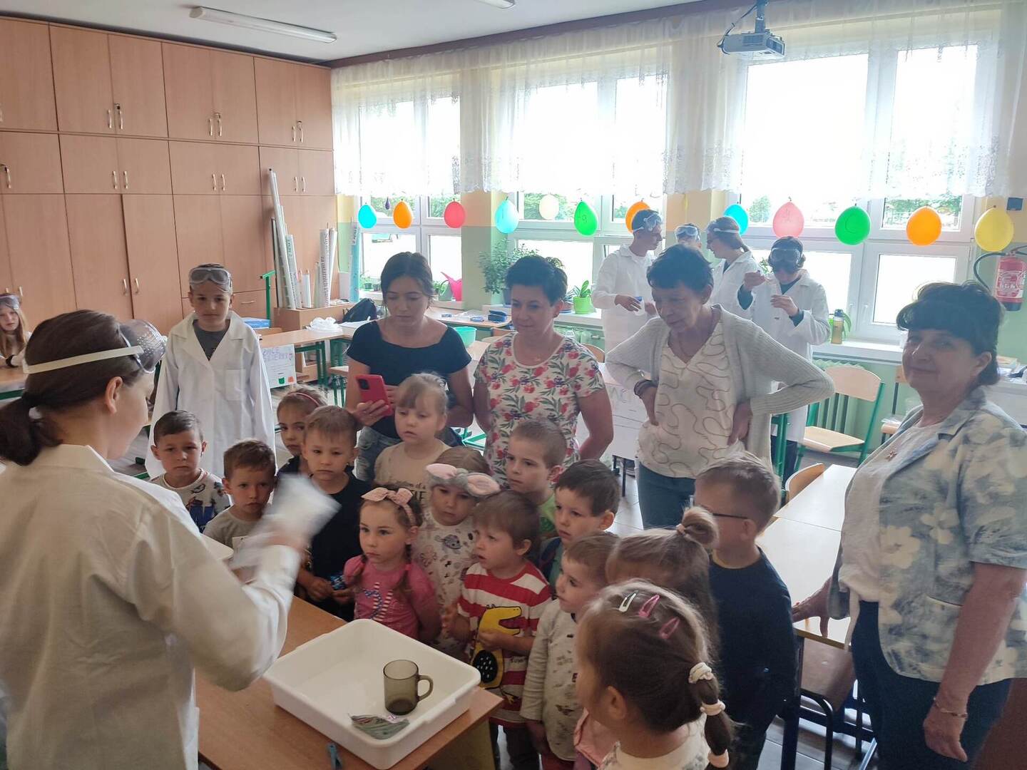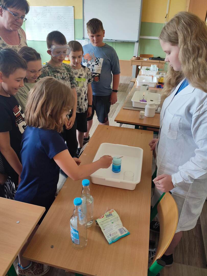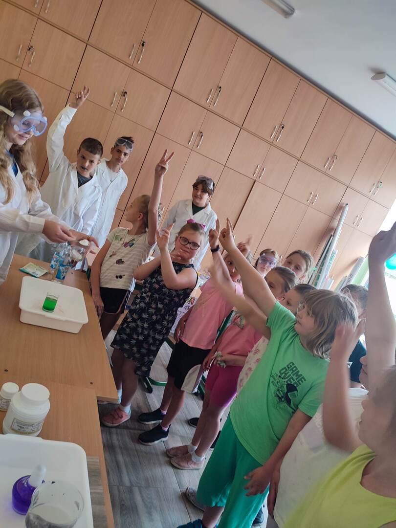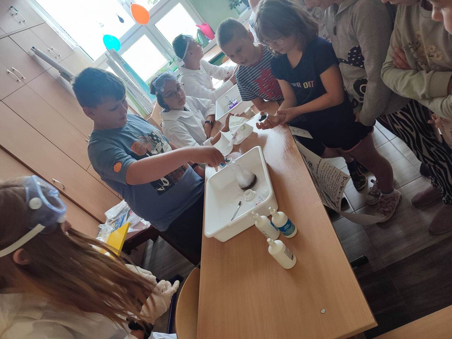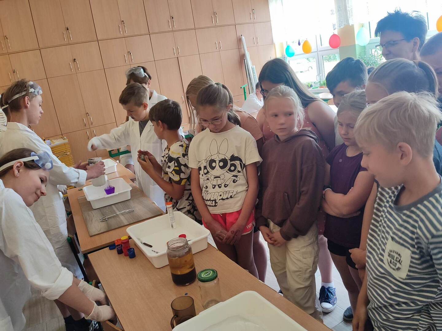 Dnia 13 czerwca 2023r. po raz pierwszy w naszej szkole odbył się Dzień Chemika. Uczniowie z klasy siódmej i ósmej pod okiem nauczyciela chemii przygotowali doświadczenia chemiczne dla swoich kolegów z klas młodszych. W ten sposób chcieli zachęcić ich do nauki chemii oraz pokazać piękno, mądrość i niezliczone tajemnice, jakie kryje ta dziedzina nauk przyrodniczych. Uczniowie, wykonując doświadczenia, zaprezentowali umiejętności bezpiecznego posługiwania się wybranym sprzętem laboratoryjnym, odczynnikami chemicznymi oraz wyjaśniali przebieg procesów chemicznych zachodzących podczas doświadczeń. Pokazy chemiczne cieszyły się dużym zainteresowaniem zarówno wśród uczniów, którzy je wykonywali oraz tych, którzy je oglądali.