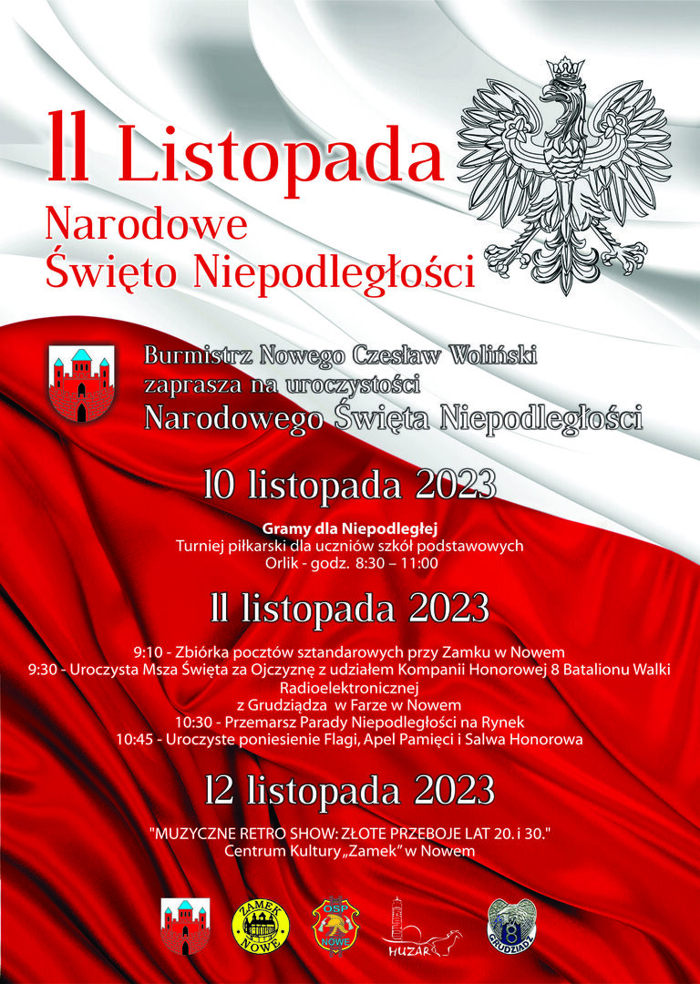 11 listopada 2023 r. o godz. 910 zbiórka przy zamku w Nowem, a następnie przejście do Fary i Msza Święta. Po Mszy przejście na Rynek i uroczysty Apel Pamięci. Uroczystości będzie uświetniała kompania honorowa 8 Batalionu Walki Radioelektronicznej z Grudziądza.