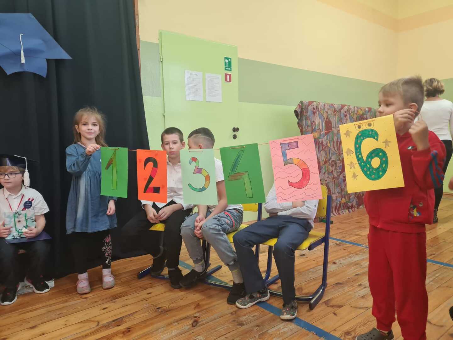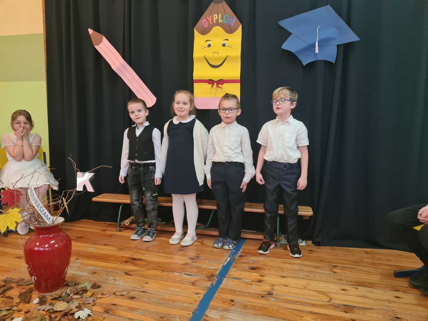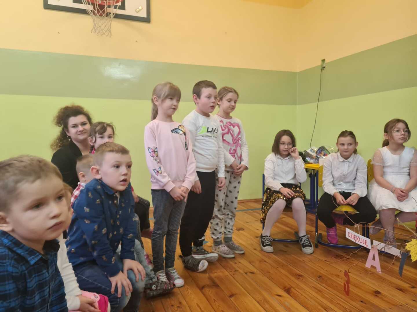 W sali gimnastycznej zgromadzili się zaproszeni goście: pani dyrektor Bożena Bienek, rodzice pierwszoklasistów, przedszkolaki i uczniowie klasy II i III z wychowawczyniami.