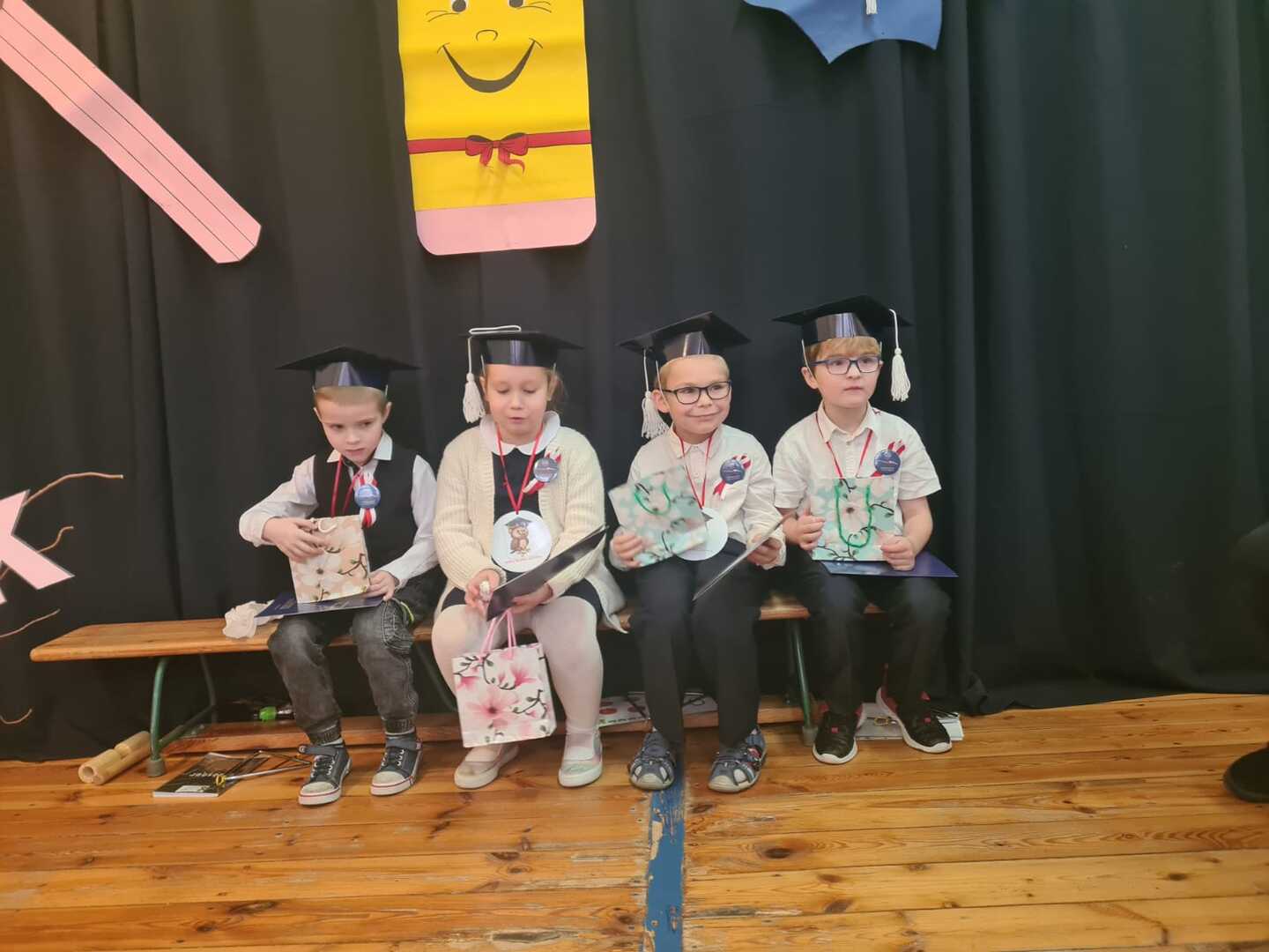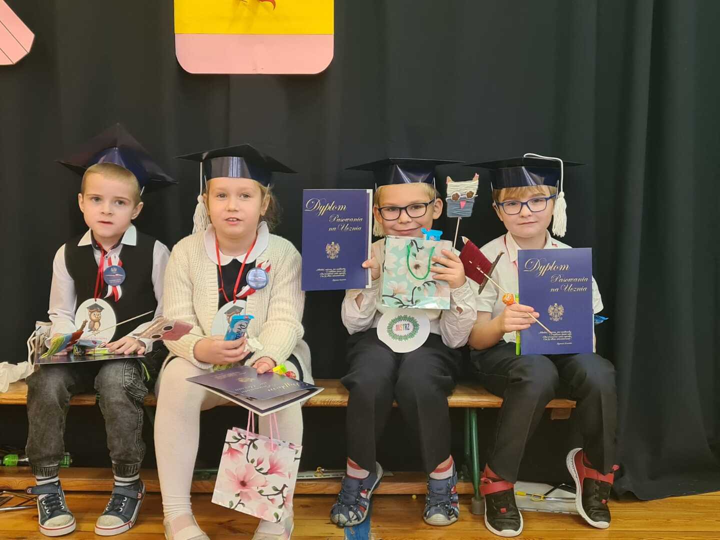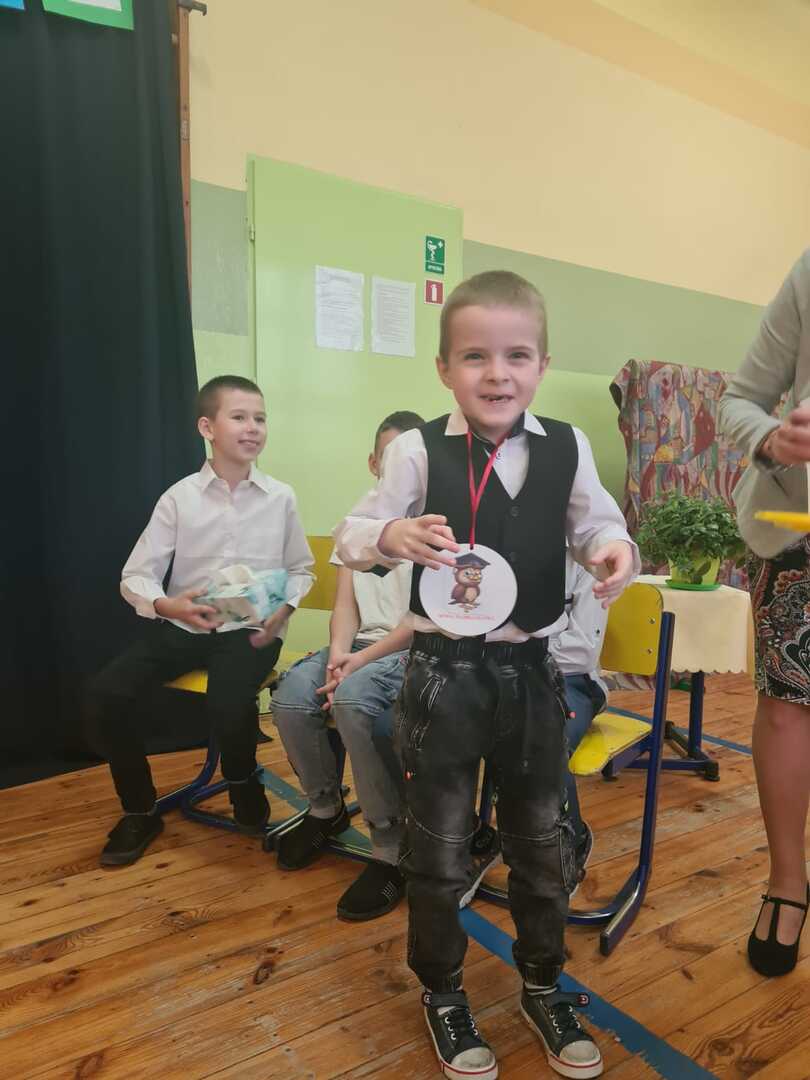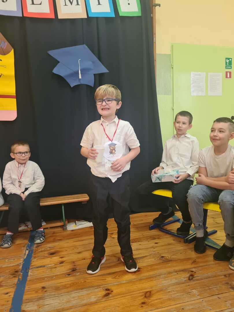 Potem zaproszeni goście oraz wychowawczyni pani Barbara Różkowska wręczyła świeżo upieczonym uczniom upominki. Koleżanki i koledzy ze starszych klas także przygotowali niespodziankę: krótki program artystyczny i drobne prezenty bardzo ucieszyły pierwszoklasistów.
