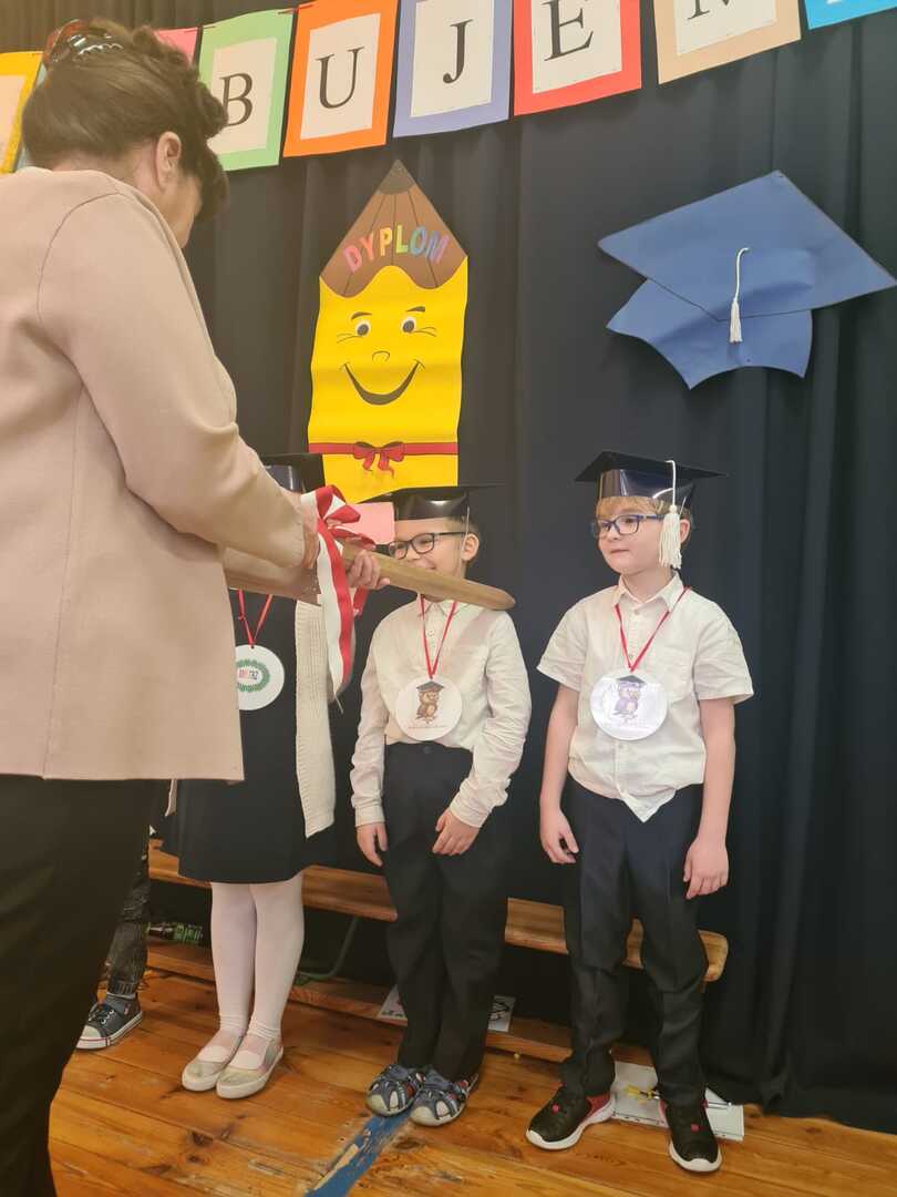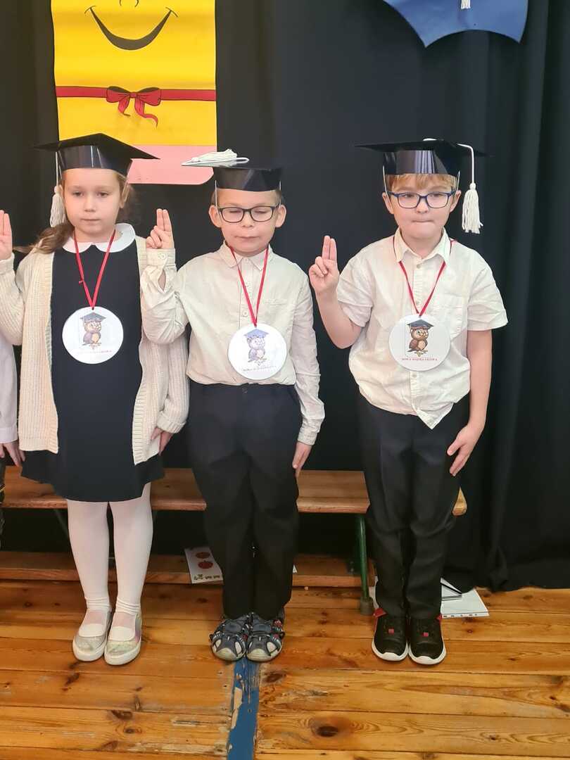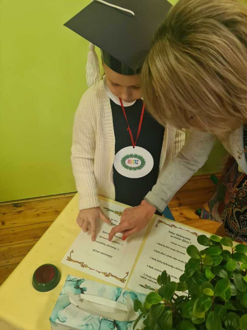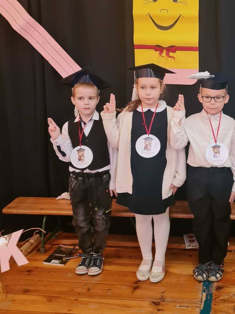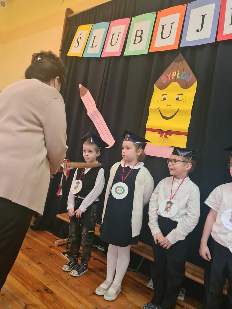 Rodzice założyli dzieciom birety i pierwszoklasiści złożyli uroczyste ślubowanie. Po nim pani Dyrektor ogromnym ołówkiem pasowała każdego na ucznia Szkoły Podstawowej nr 1 w Trylu. Każdy uczeń przypieczętował swoje przyrzeczenie „krwią” (palcem umoczonym w czerwonym tuszu).