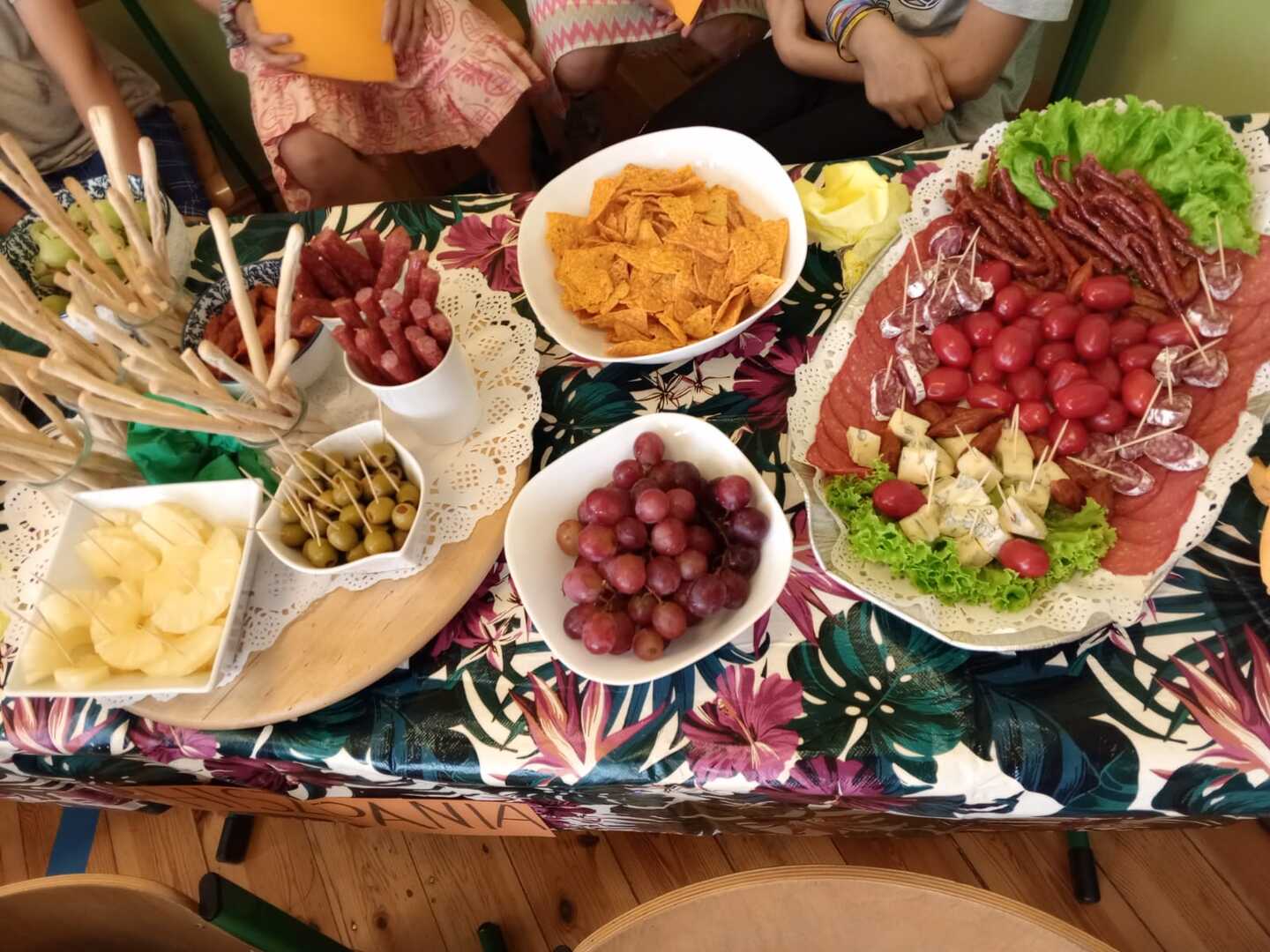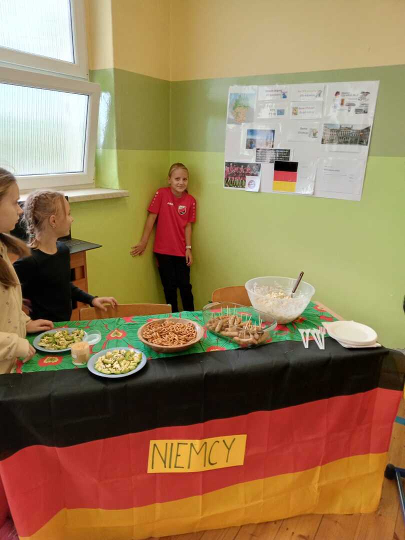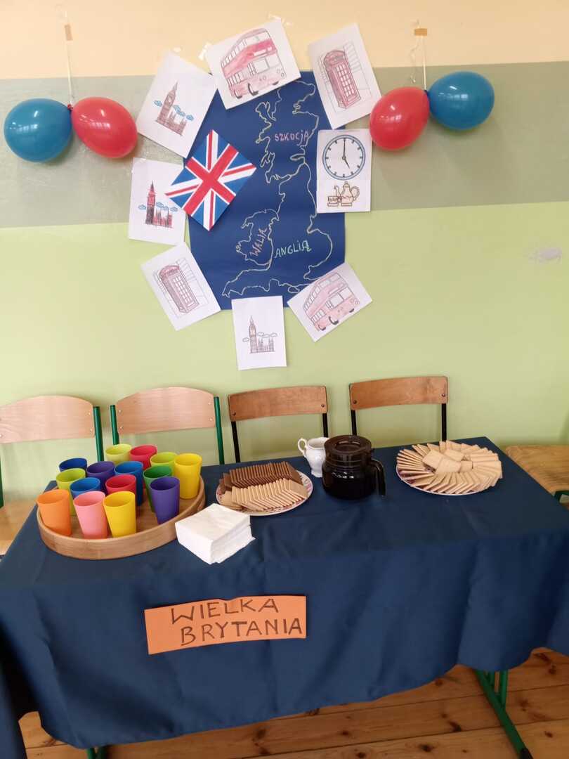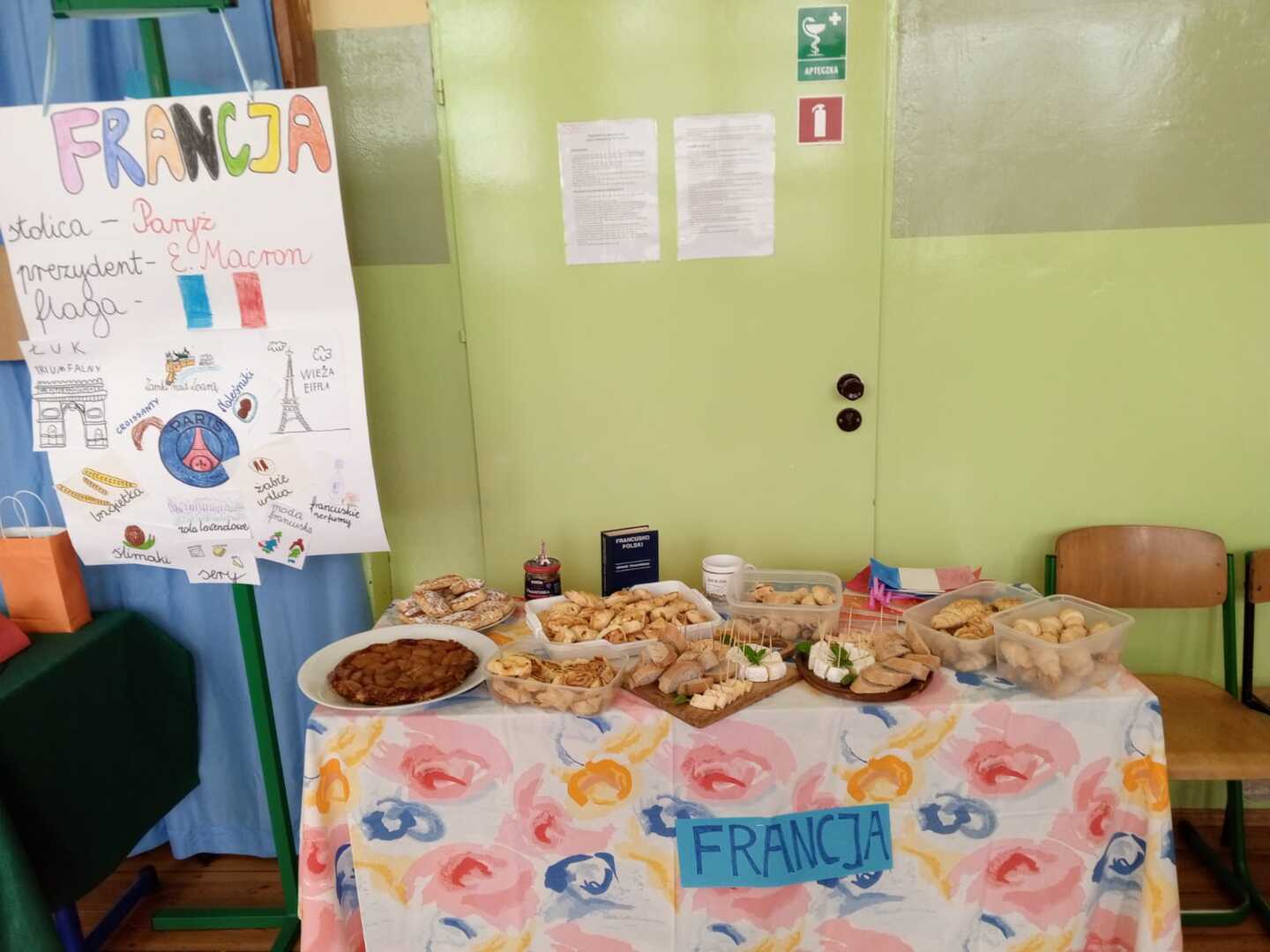 plakaty, stoiska z wystrojem z danego kraju, potrawy, uczniowie