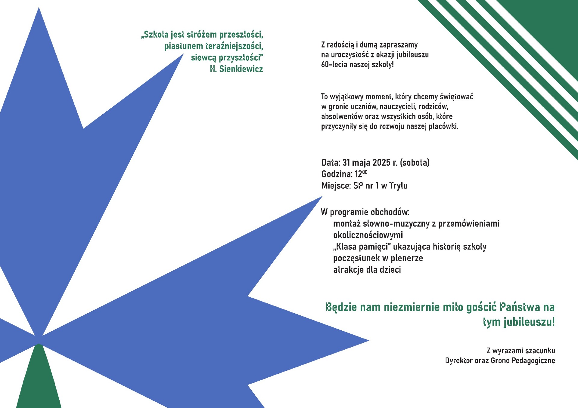 Serdecznie zapraszamy przyjaciół, znajomych, rodziny, uczniów oraz absolwentów na uroczyste obchody Jubileuszu naszej Szkoły, które rozpoczną się 31 maja 2025 r. o godz. 1200. Szczegóły w załączniku.