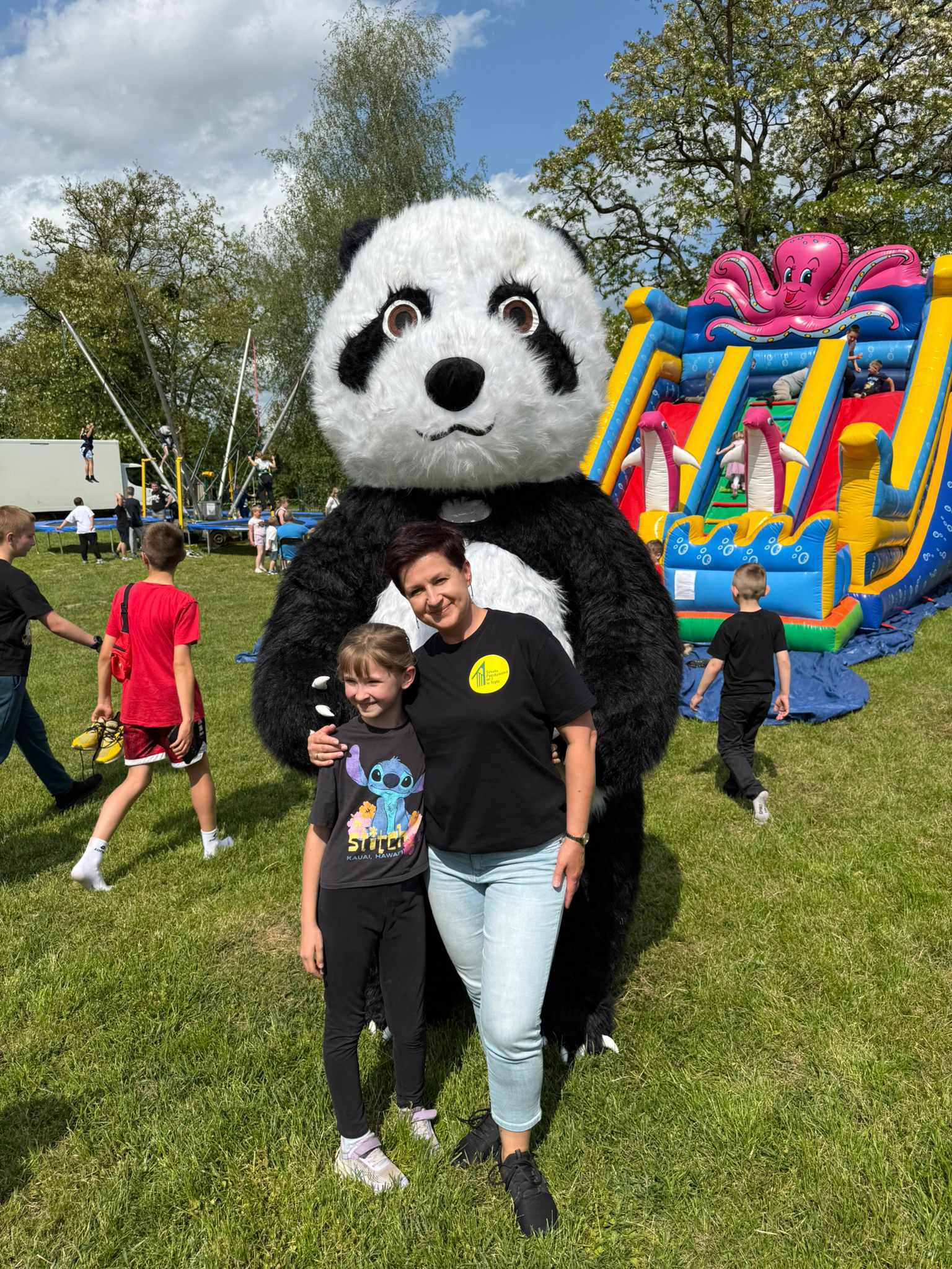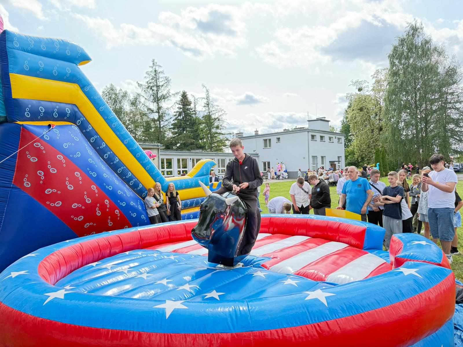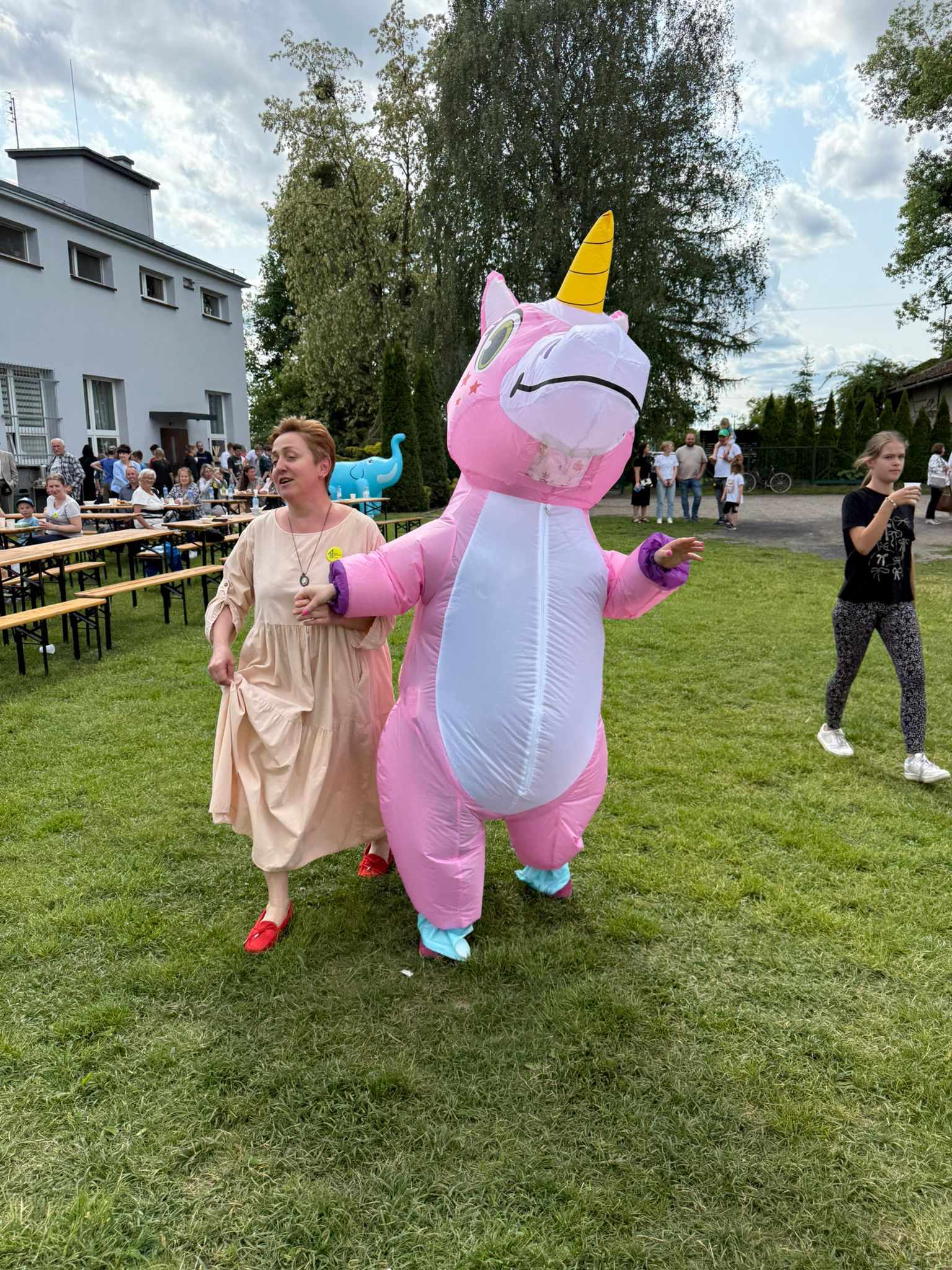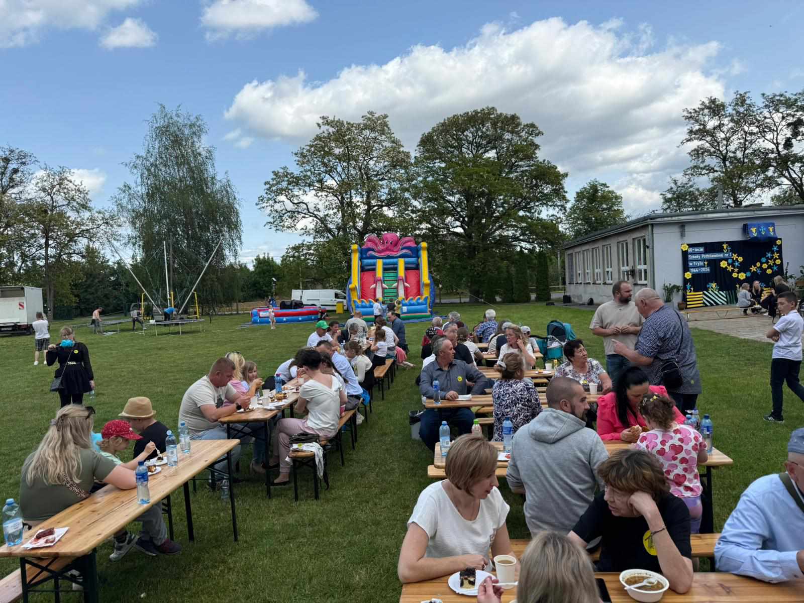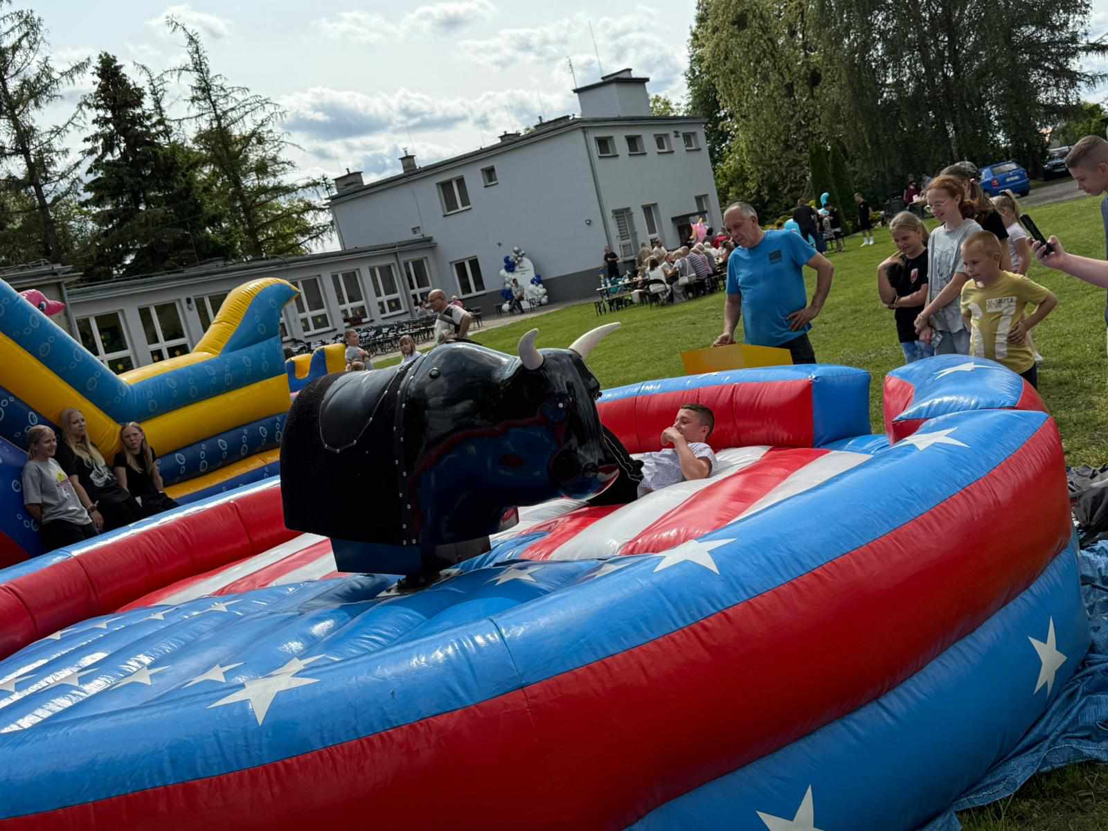 Rada Rodziców przygotowała dla dzieci mnóstwo atrakcji na zewnątrz: dmuchane zjeżdżalnie, maskotki panda i jednorożec, trampoliny, banji, konkursy, zabawy, kiełbaski z grilla, grochówkę wojskową, watę cukrową , słodycze, tort urodzinowy, pokazy strażackie, a temu wszystkiemu towarzyszyły dźwiękai muzyki zespołu A&A, którego liderem jest absolwent naszej szkoły Aleksander Maciejewski.