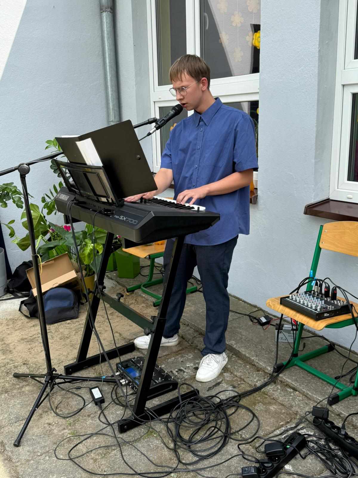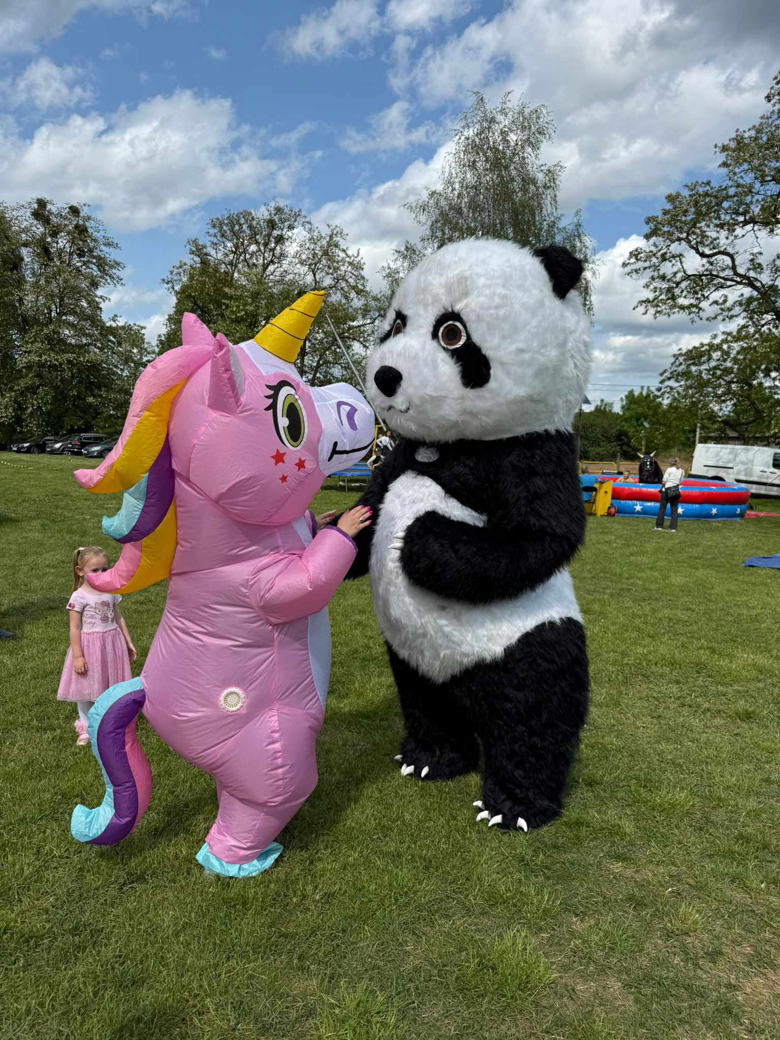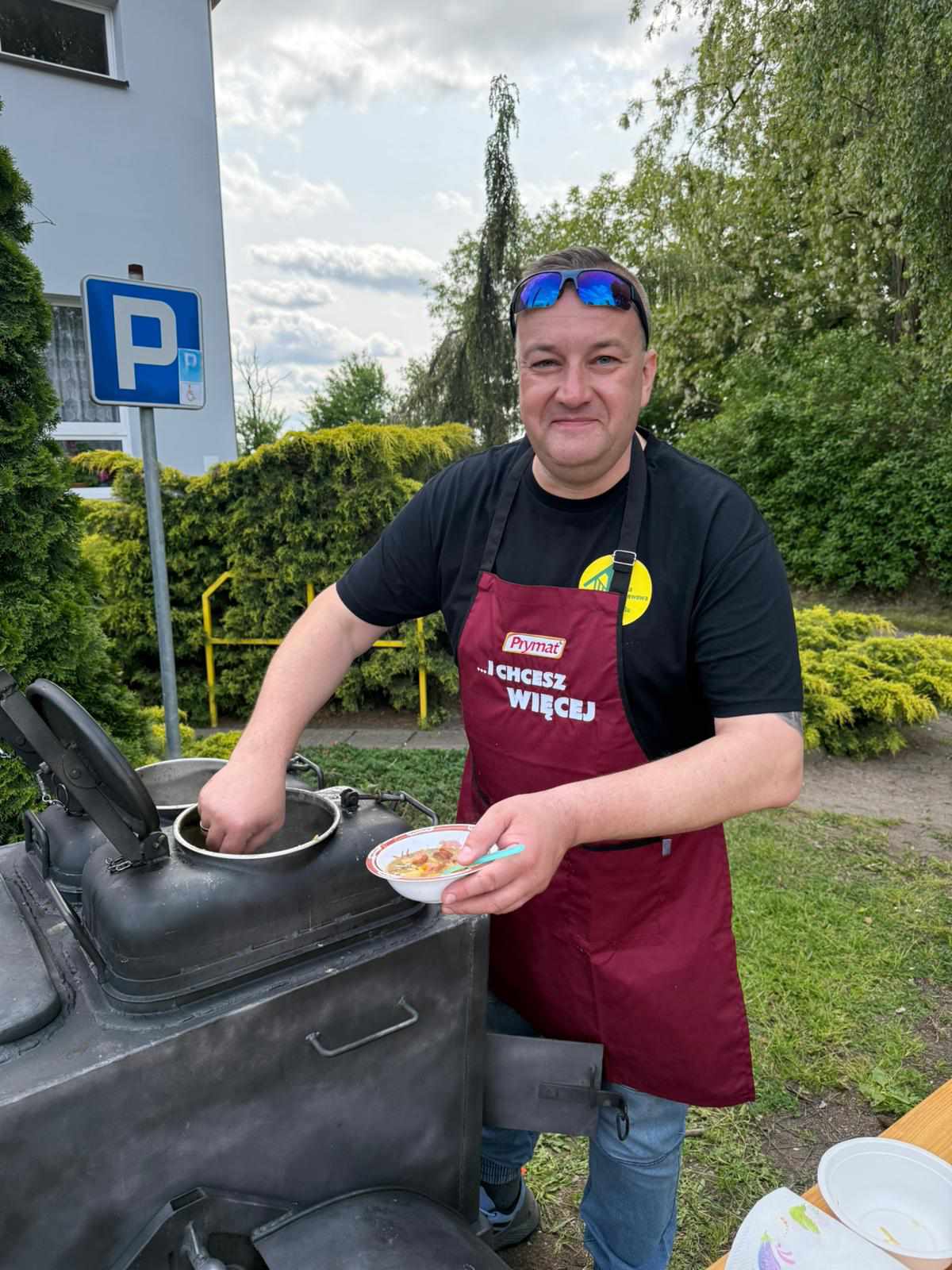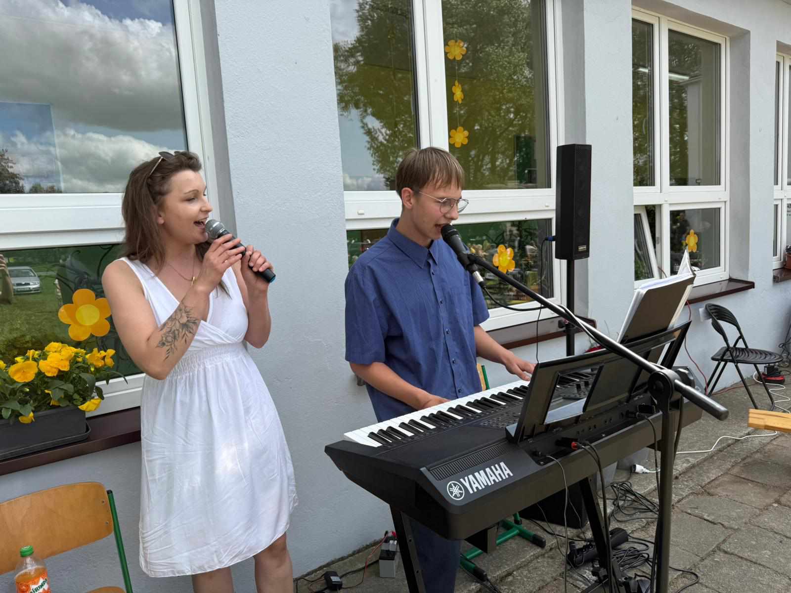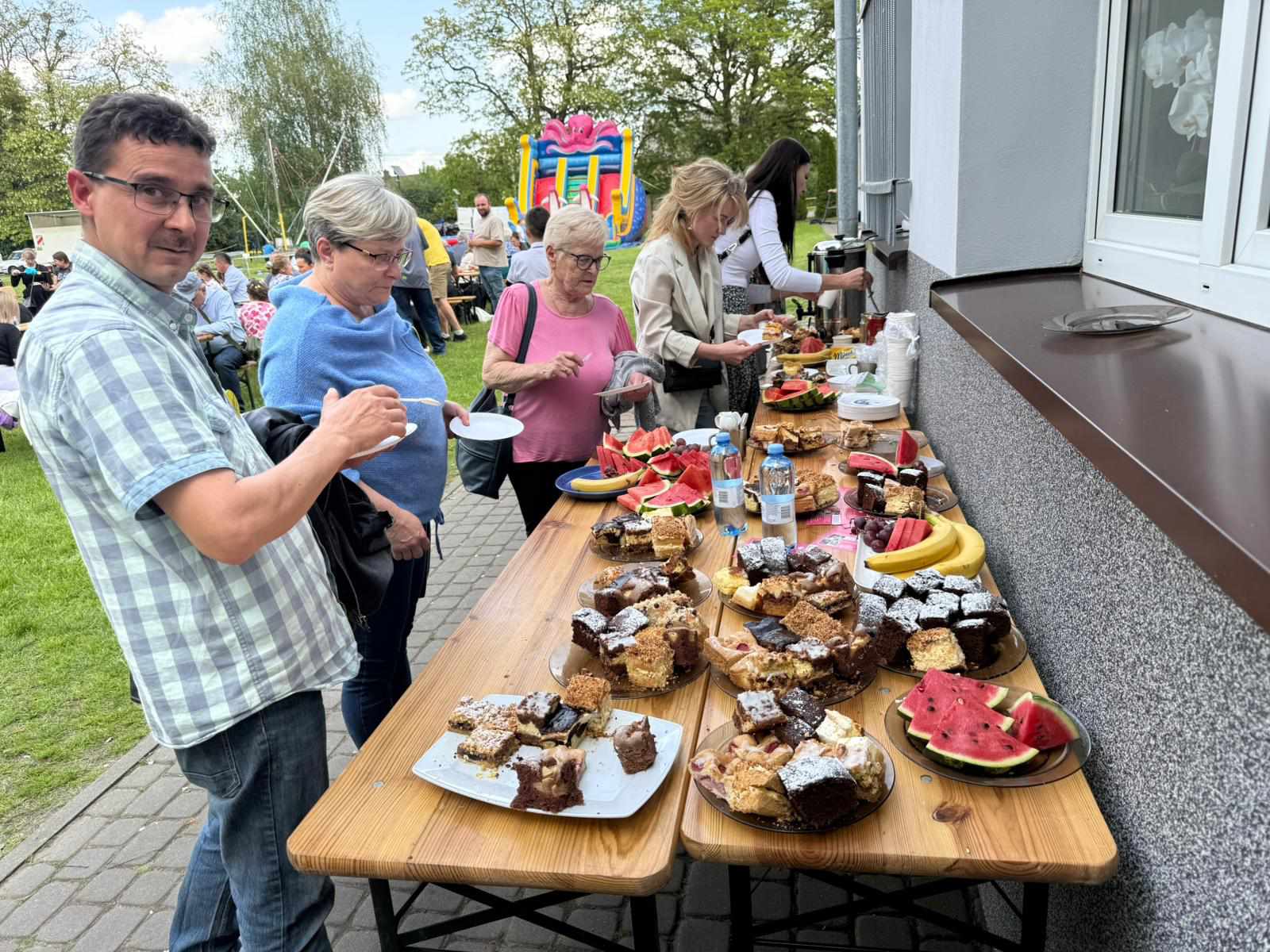 Rada Rodziców przygotowała dla dzieci mnóstwo atrakcji na zewnątrz: dmuchane zjeżdżalnie, maskotki panda i jednorożec, trampoliny, banji, konkursy, zabawy, kiełbaski z grilla, grochówkę wojskową, watę cukrową , słodycze, tort urodzinowy, pokazy strażackie, a temu wszystkiemu towarzyszyły dźwiękai muzyki zespołu A&A, którego liderem jest absolwent naszej szkoły Aleksander Maciejewski.