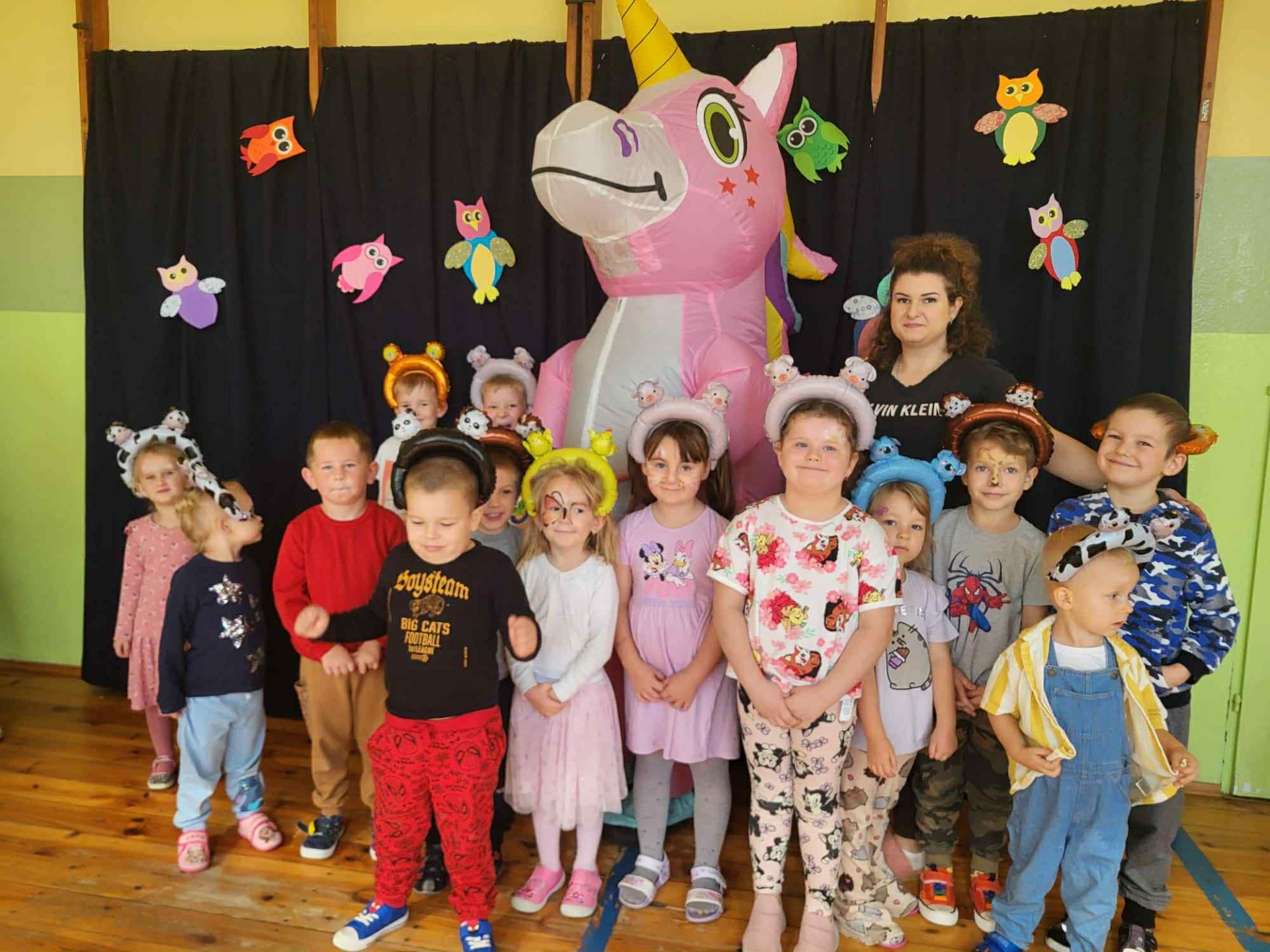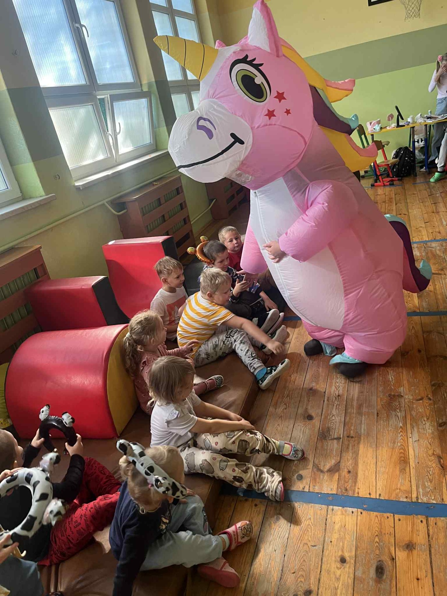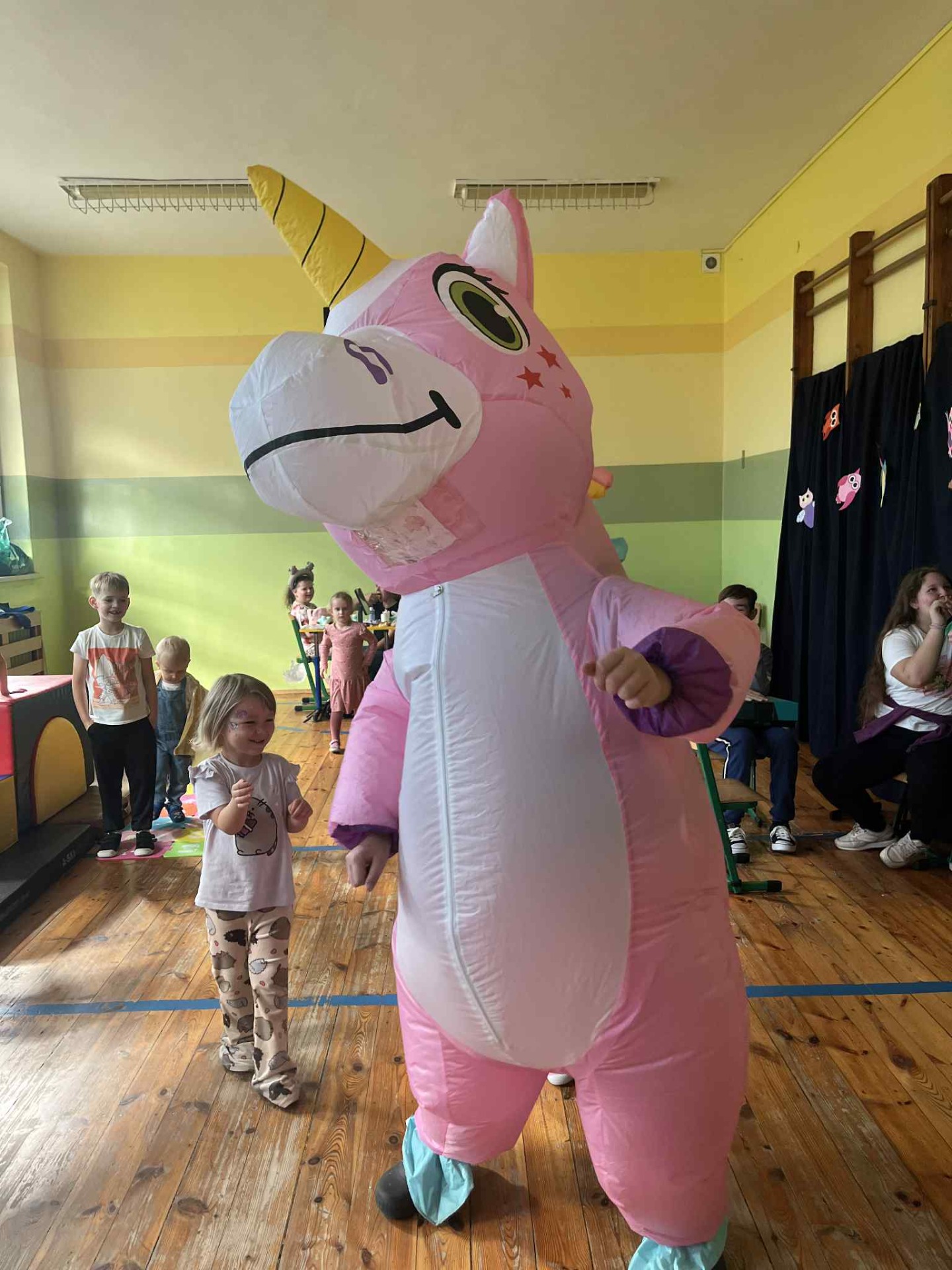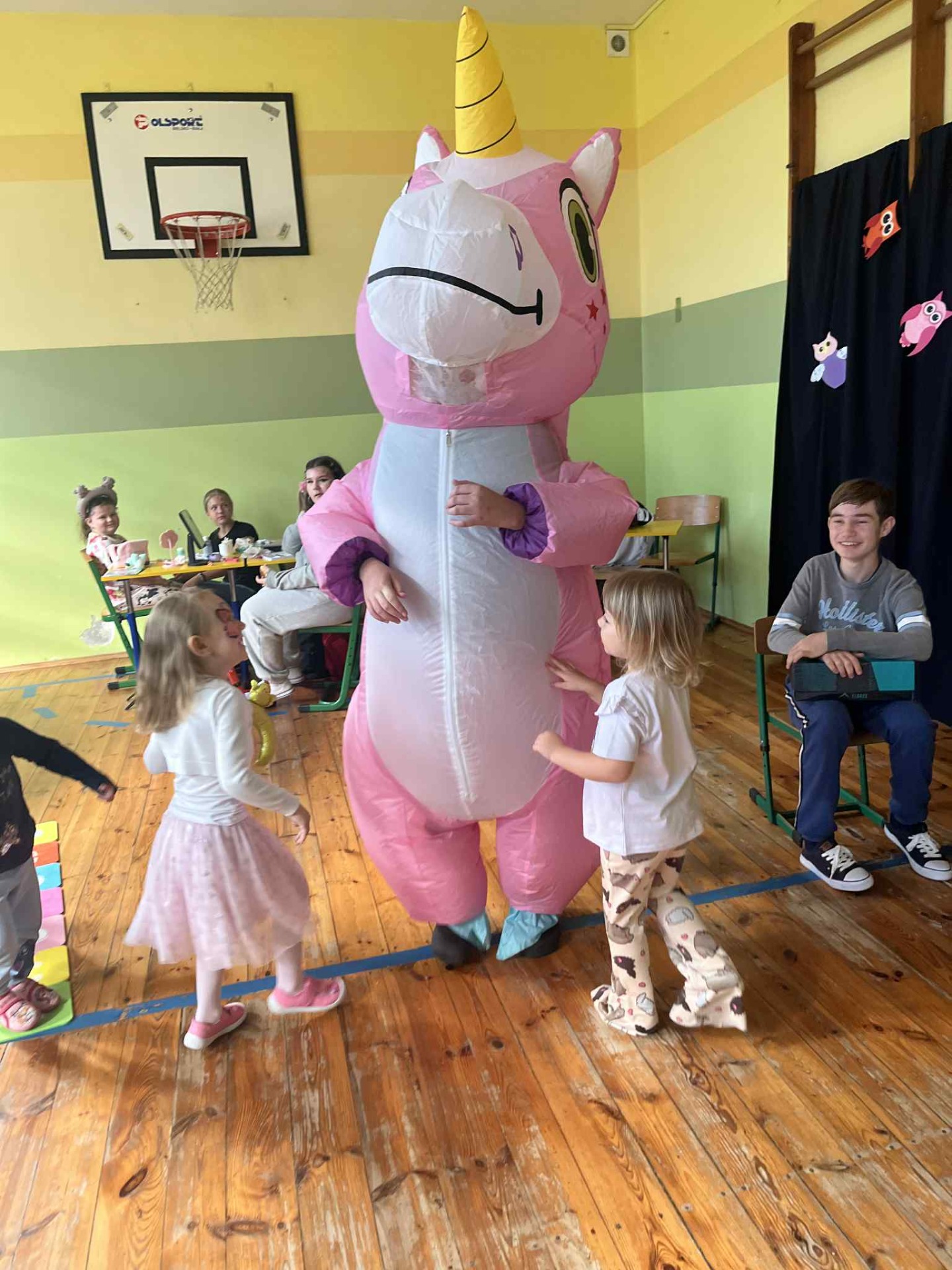Największą niespodzianką okazała się wizyta maskotki – wesołego jednorożca 🦄, który towarzyszył dzieciom w zabawie.